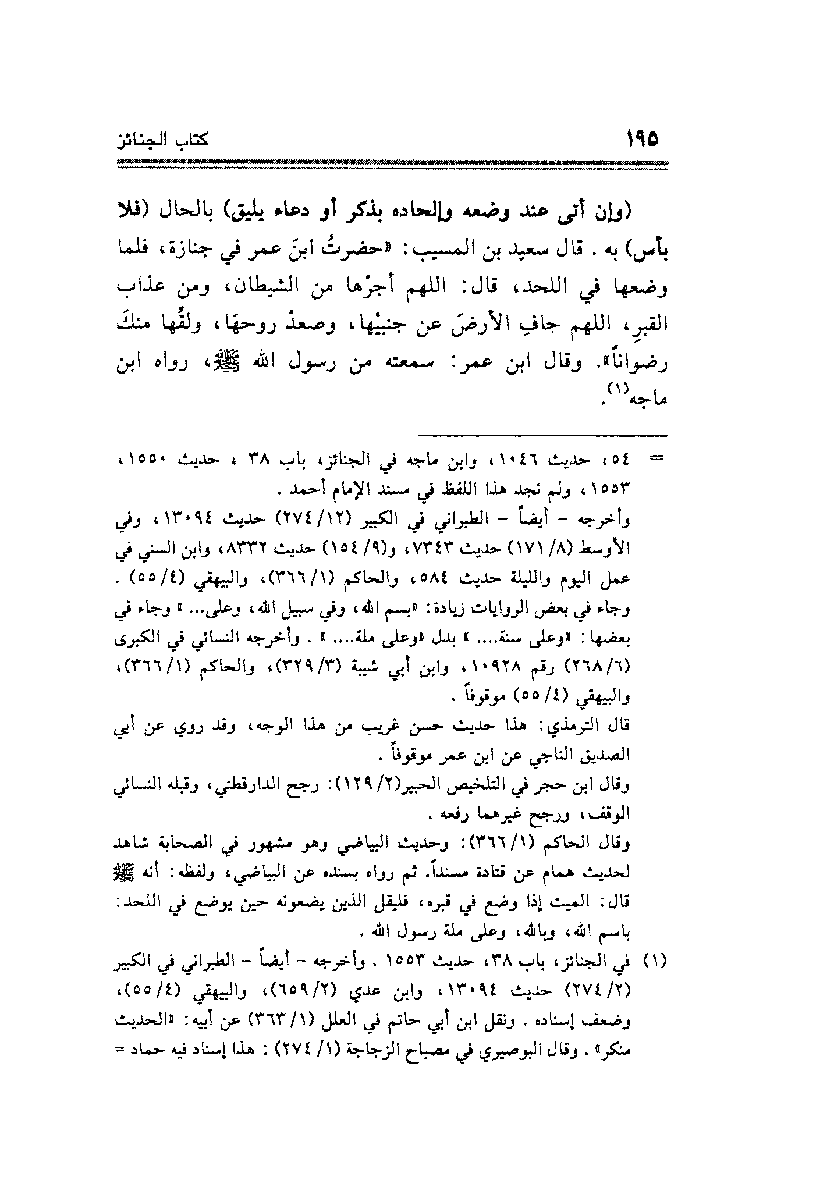(وإن أتى عند وضعه وإلحاده بذكر أو دعاء يليق) بالحال (فلا بأس) به. قال سعيد بن المسيب: "حضرتُ ابنَ عمر في جنارة، فلما وضعها في اللحد، قال: اللهم أجزها من الشيطان، ومن عذاب القبرِ، اللهم جافِ الأرضَ عن جنبيْها، وصعدْ روحهَا، ولقِّها منكَ رضواناً". وقال ابن عمر: سمعته من رسول الله - صلى الله عليه وسلم -، رواه ابن ماجه (¬١).