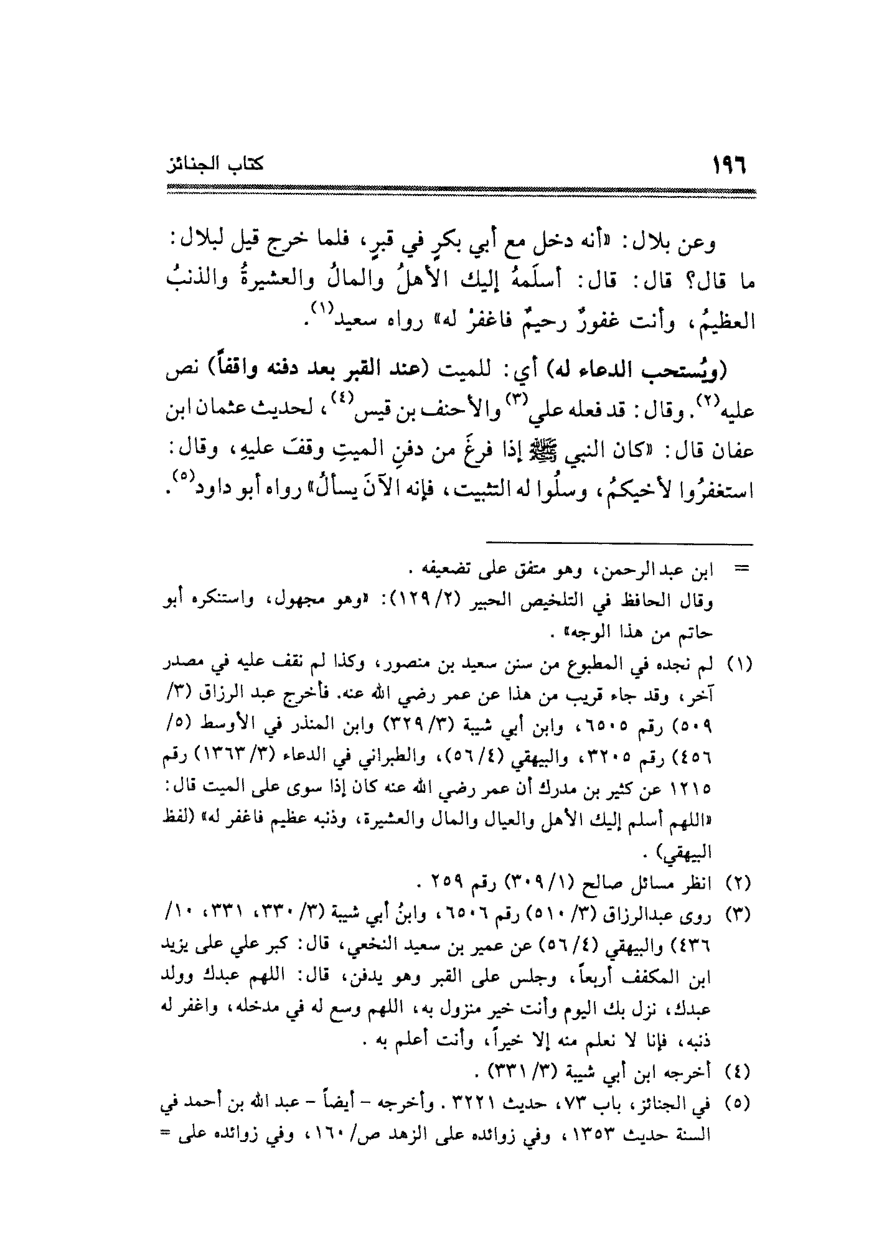 وعن بلال: "أنه دخل مع أبي بكرٍ في قبر، فلما خرج قيل لبلال: ما قال؟ قال: قال: أسلَمهُ إليك الأهلُ والمالُ والعشيرةُ والذنبُ العظيمُ، وأنت غفورٌ رحيمٌ فاغفرْ له" رواه سعيد (¬١).