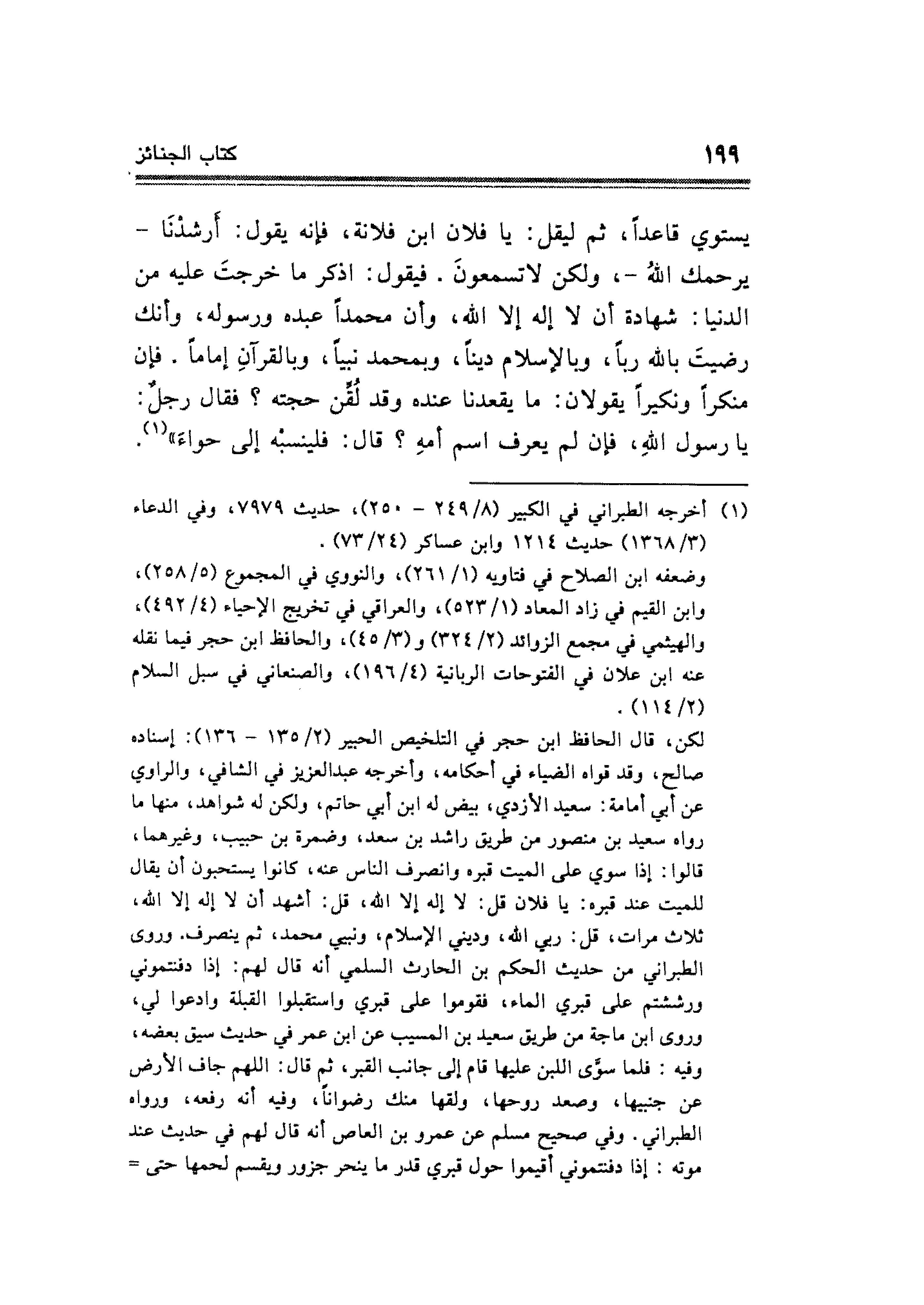 لكن، قال الحافظ ابن حجر في التلخيص الحبير (٢/ ١٣٥ - ١٣٦): إسناده صالح، وقد قواه الضياء في أحكامه، وأخرجه عبد العزيز في الشافي، والراوي عن أبي أمامة: سعيد الأزدي، بيض له ابن أبي حاتم، ولكن له شواهد، منها ما رواه سعيد بن منصور من طريق راشد بن سعد، وضمرة بن حبيب، وغيرهما، قالوا: إذا سوي على الميت قبره وانصرف النَّاس عنه، كانوا يستحبون أن يقال للميت عند قبره: يا فلان قل: لا إله إلَّا الله، قل: أشهد أن لا إله إلَّا الله، ثلاث مرات، قل: ربي الله، وديني الإسلام، ونبيي محمد، ثم ينصرف. وروى الطّبرانيّ من حديث الحكم بن الحارث السلمي أنَّه قال لهم: إذا دفنتموني ورششتم على قبري الماء، فقوموا على قبري واستقبلوا القبلة وادعوا لي، وروى ابن ماجه من طريق سعيد بن المسيب عن ابن عمر في حديث سيق بعضه، وفيه: فلما سوَّى اللبن عليها قام إلى جانب القبر، ثم قال: اللَّهم جاف الأرض عن جنبيها، وصعد روحها، ولقها منك رضوانًا، وفيه أنه رفعه، ورواه الطّبرانيّ. وفي صحيح مسلم عن عمرو بن العاص أنَّه قال لهم في حديث عند موته: إذا دفنتموني أقيموا حول قبري قدر ما ينحر جزور ويقسم لحمها حتى =