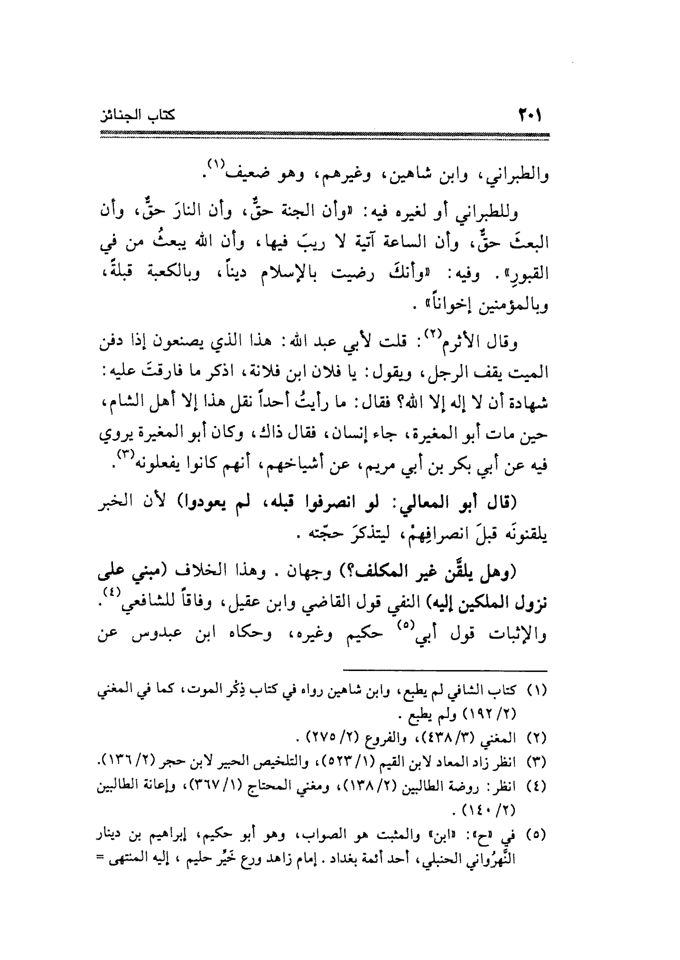 (¬١) كتاب الشافي لم يطبع، وابن شاهين رواه في كتاب ذِكر الموت، كما في المغني (٣/ ١٩٢) ولم يطبع.
