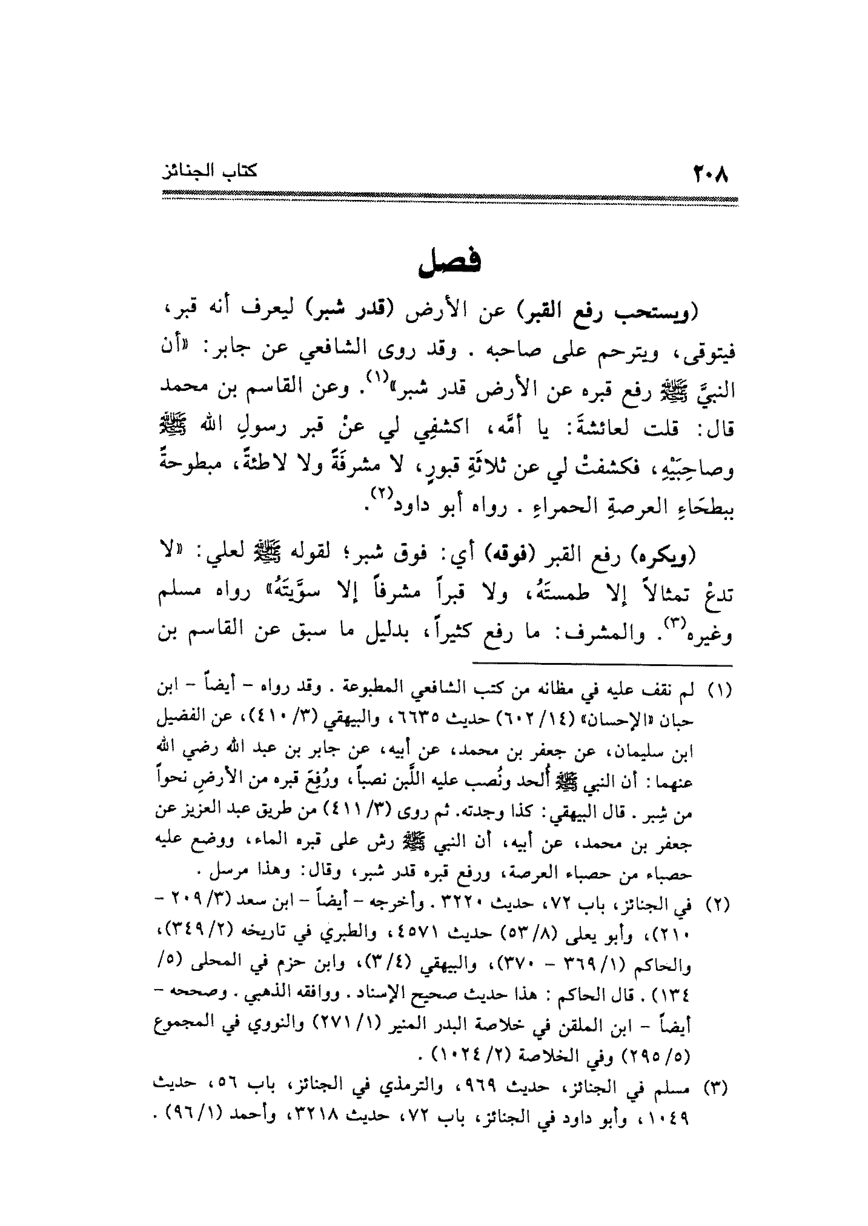(ويستحب رفع القبر) عن الأرض (قدر شبر) ليعرف أنه قبر، فيتوقى، ويترحم على صاحبه، وقد روى الشافعي عن جابر: "أن النَّبيِّ - صلى الله عليه وسلم - رفع قبره عن الأرض قدر شبر" (¬١). وعن القاسم بن محمد قال: قلت لعائشةَ: يا أمَّه، اكشفِي لي عنْ قبر رسولِ الله - صلى الله عليه وسلم - وصاحِبَيْهِ، فكشفتْ لي عن ثلاثَةِ قبورٍ، لا مشرفَةً ولا لاطئةً، مبطوحةً ببطحَاءِ العرصةِ الحمراءِ. رواه أبو داود (¬٢).