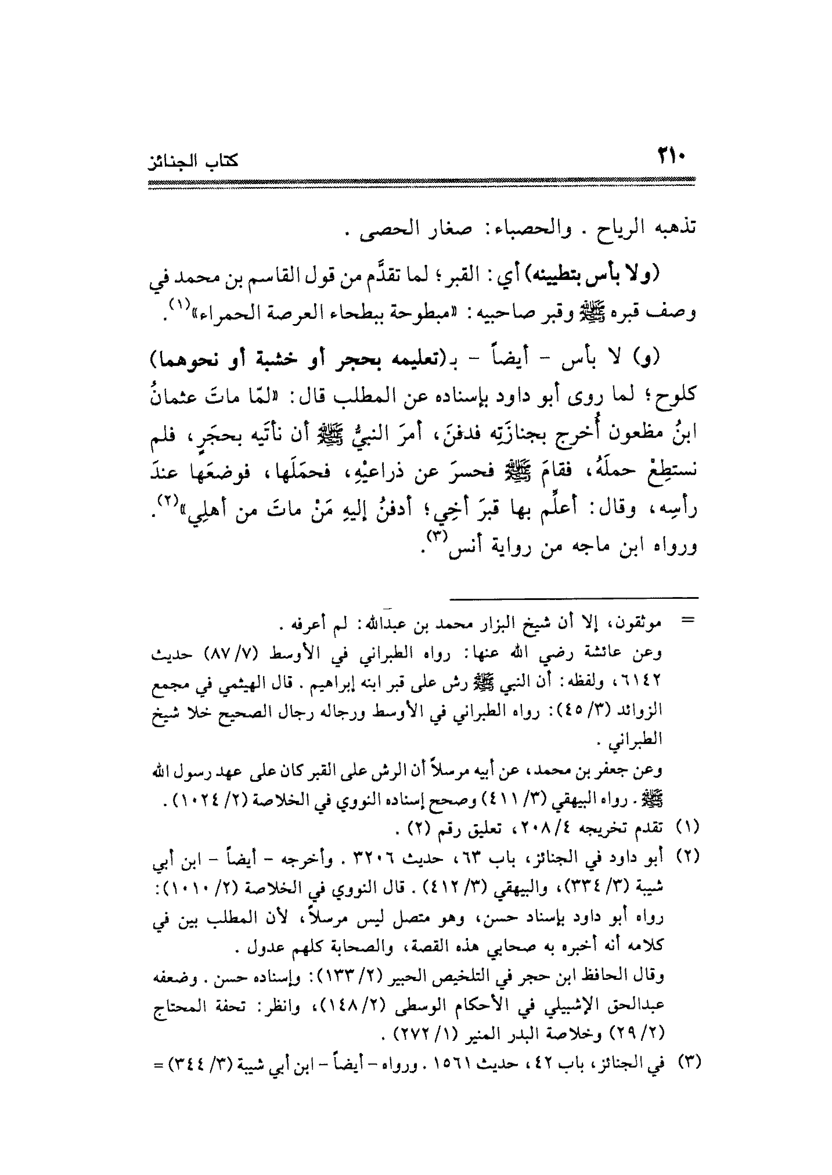 (و) لا بأس -أيضًا- بـ (تعليمه بحجر أو خشبة أو نحوهما) كلوح؛ لما روى أبو داود بإسناده عن المطلب قال: "لمّا ماتَ عثمانُ ابنُ مظعون أُخرج بجنازَتِه فدفنَ، أمرّ النبيُّ - صلى الله عليه وسلم - أن نأتَيه بحجَرٍ، فلم نستطِعْ حملَة، فقامَ - صلى الله عليه وسلم - فحسرَ من ذراعيْهِ، فحمَلَها، فوضعَها عندَ رأسِه، وقال: أعلِّم بها قبرَ أخِي؛ أدفنُ إليهِ مَنْ ماتَ من أهلِي" (¬٢). ورواه ابن ماجه من رواية أنس (¬٣).