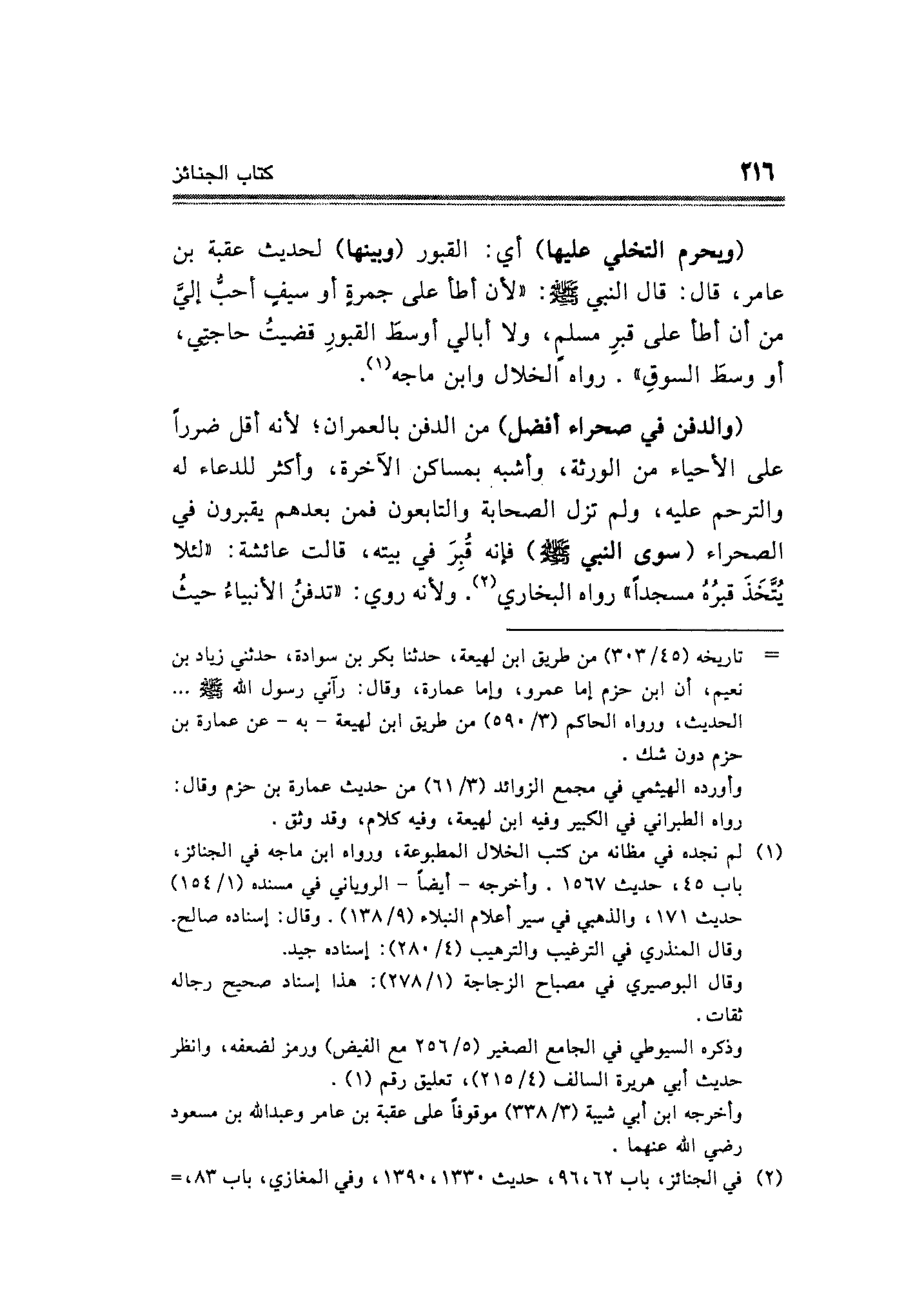 (والدفن في صحراء أفضل) من الدفن بالعمران؛ لأنه أقل ضررًا كلى الأحياء من الورثة، وأشبه بمساكن الآخرة، وأكثر للدعاء له والترحم عليه، ولم تزل الصحابة والتابعون فمن بعدهم يقبرون في الصحراء (سوى النبي - صلى الله عليه وسلم -) فإنه قُبِرَ في بيته" قالت عائشة: "لئلا يُتَّخَذَ قبرُهُ مسجدًا" رواه البخاري (¬٢). ولأنه روى "تدفنُ الأنبياءُ حيثُ