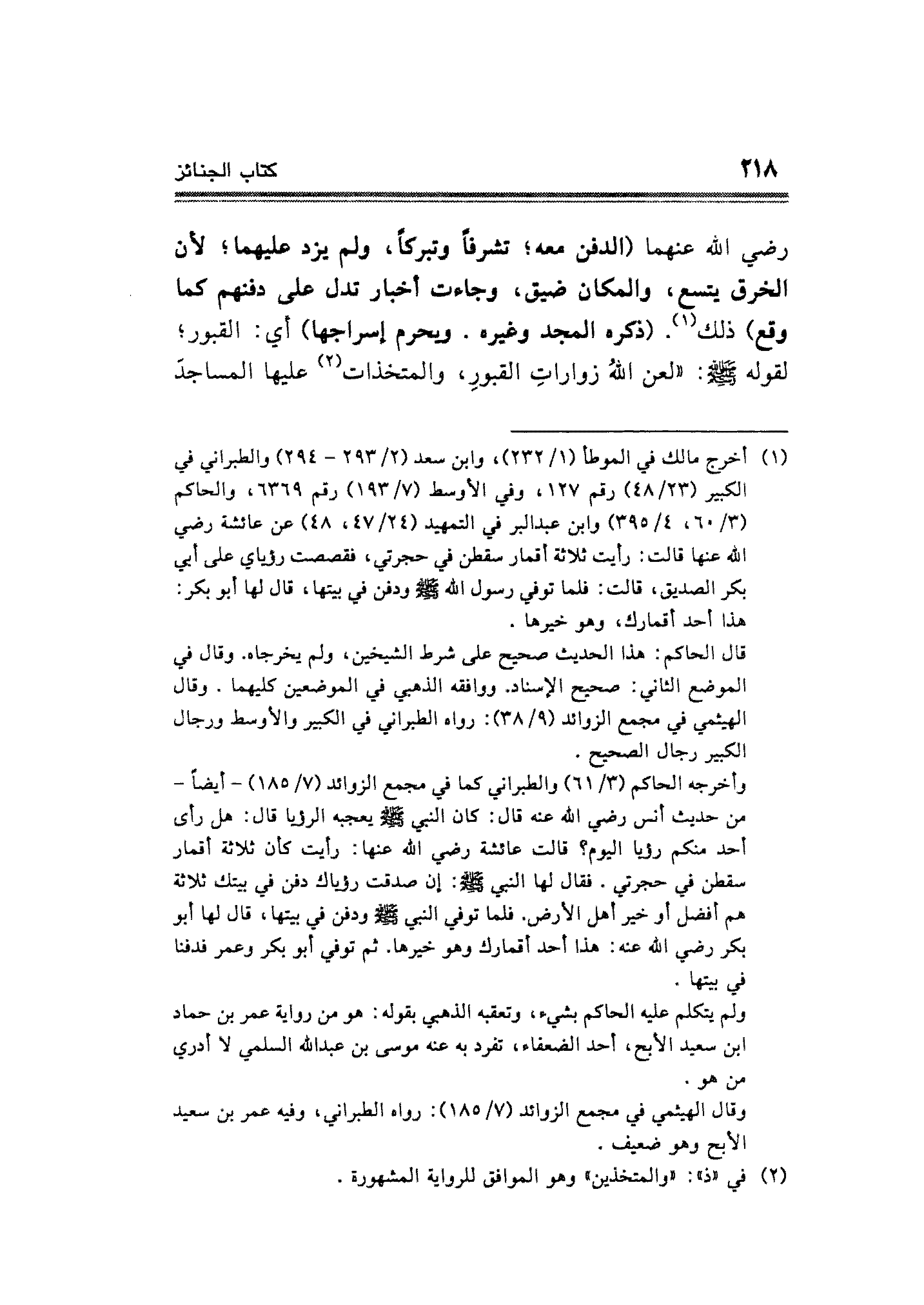 رضي الله عنهما (الدفن معه؛ تشرفًا وتبركًا، ولم يزد عليهما؛ لأن الخرق يتسع، والمكان ضيق، وجاءت أخبار تدل على دفنهم كما وقع) ذلك (¬١). (ذكره المجد وغيره. ويحرم إسراجها) أي: القبور؛ لقوله - صلى الله عليه وسلم -: "لعن اللهُ زواراتِ القبورِ، والمتخذات (¬٢) عليها المساجدَ