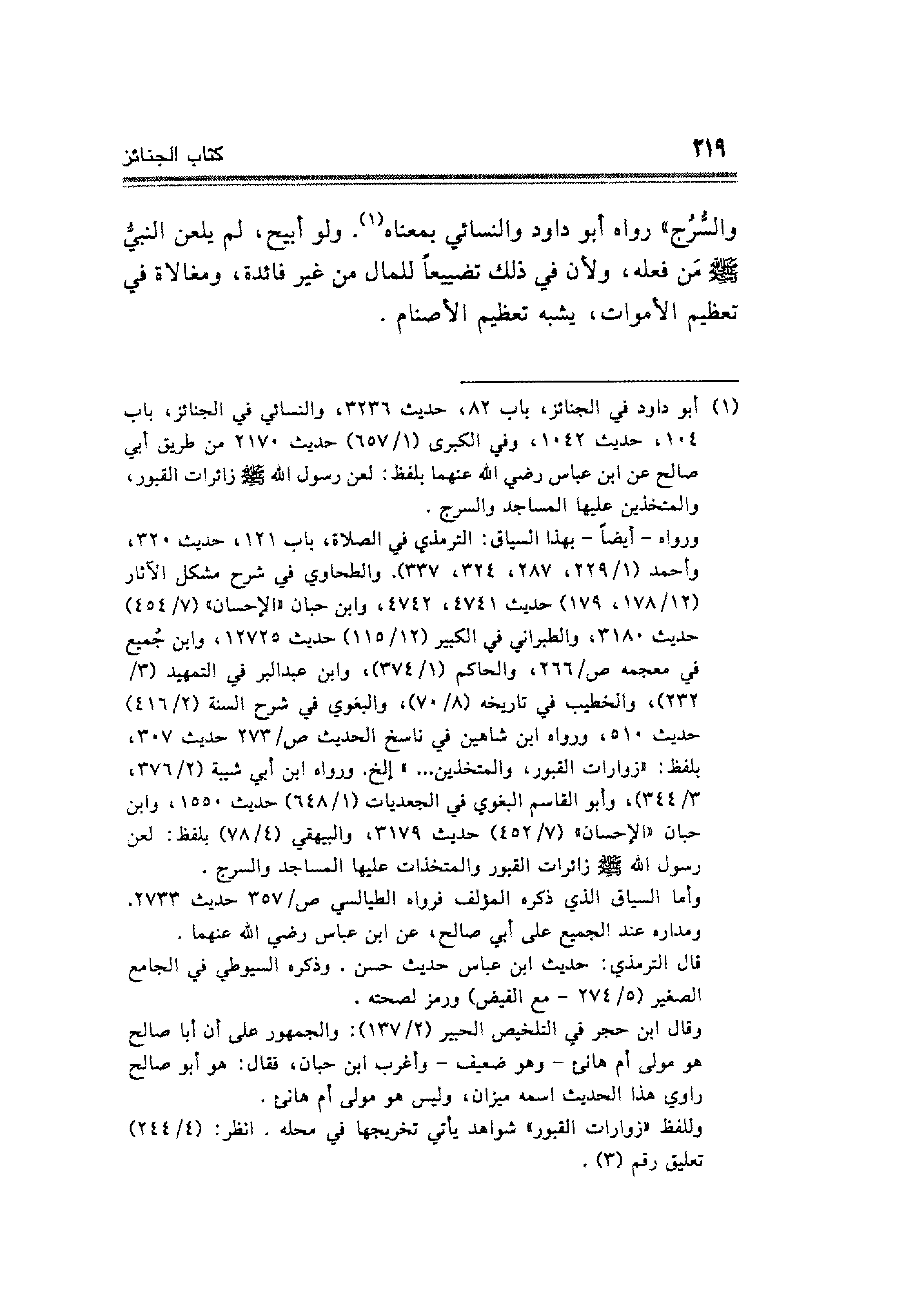 (¬١) أبو داود في الجنائز، باب ٨٢، حديث ٣٢٣٦، والنسائى في الجنائز، باب ١٠٤، حديث ١٠٤٢، وفي الكبرى (١/ ٦٥٧) حديث ٢١٧٠ من طريق أبي صالح من ابن عباس رضي الله عنهما بلفظ: لعن رسول الله - صلى الله عليه وسلم - زائرات القبور، والمتخذين عليها المساجد والسرج.