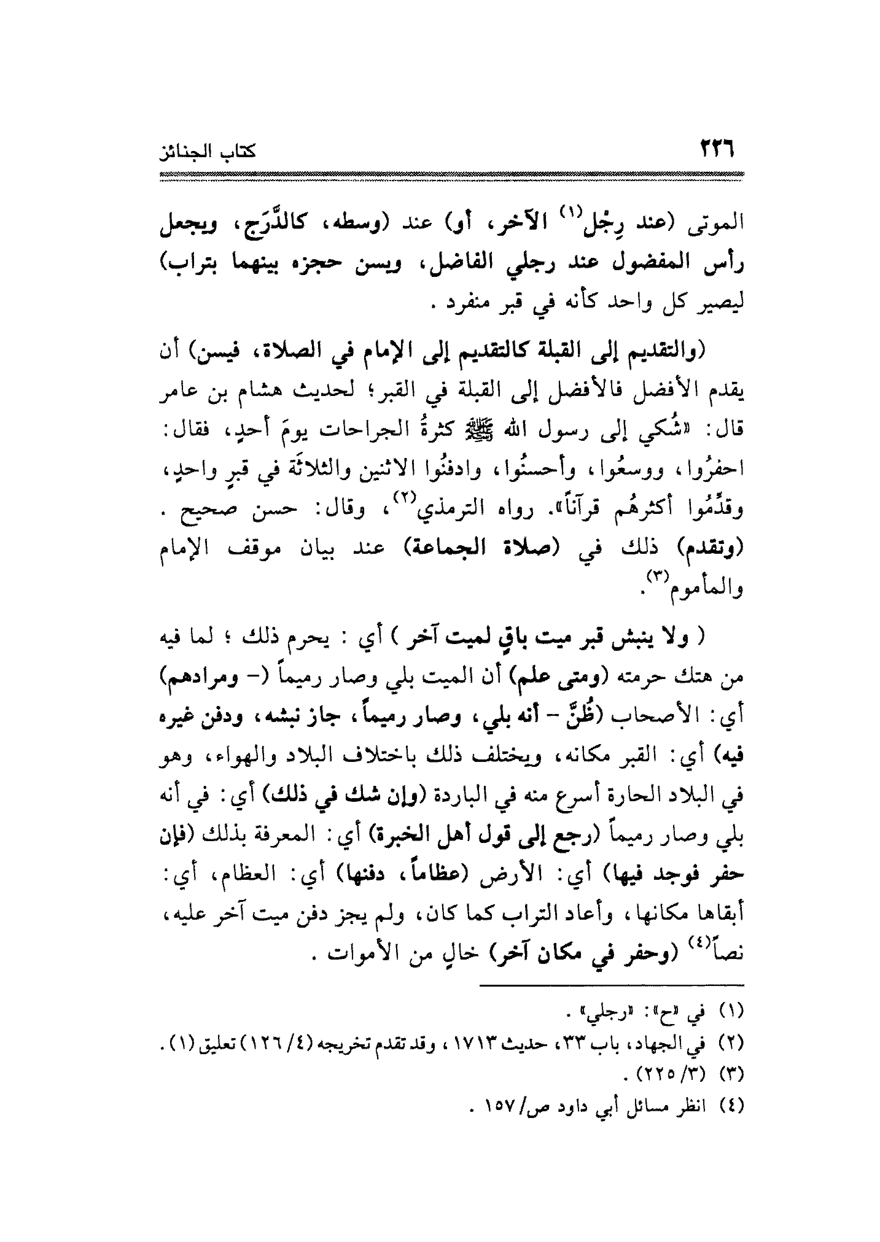 الموتى (عند رِجْل (¬١) الآخر، أو) عند (وسطه، كالدرج، ويجعل رأس المفضول عند رجلي الفاضل، ويسن حجزه بينهما بتراب) ليصير كل واحد كأنه في قبر منفرد.