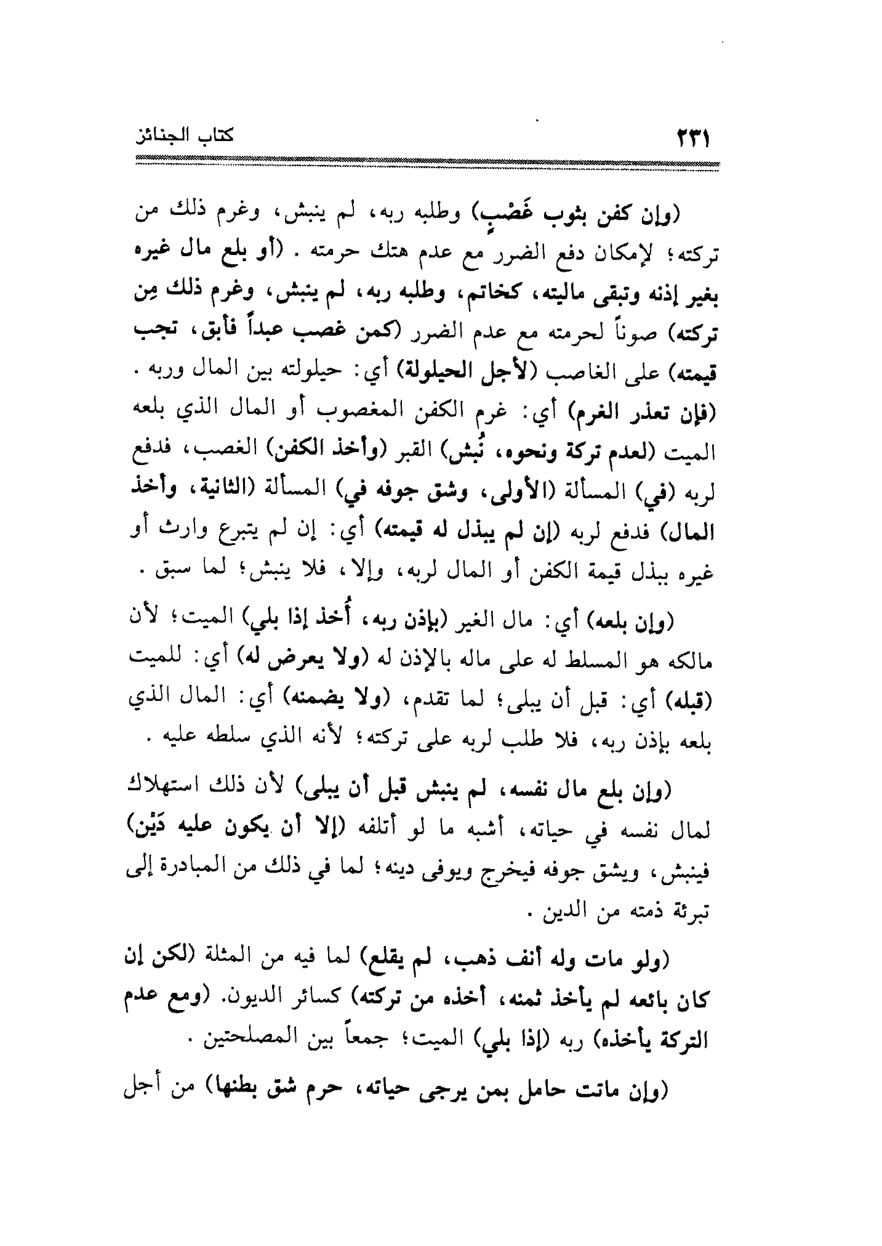 (إن كفن بثوب غَضبٍ) وطلبه ربه، لم ينبش، وغرم ذلك من تركته؛ لإمكان دفع الضرر مع عدم هتك حرمته. (أو بلع مال غيره بغير إذنه وتبقى ماليته، كخاتم وطلبه ربه، لم ينبش، وغرم ذلك مِن تركته) صونًا لحرمته مع عدم الضرر (كمن غصب عبدًا فأبق، تجب قيمته) على الغاصب (لأجل الحيلولة) أي: حيلولته بين المال وربه. (فإن تعذر الغرم) أي: غرم الكفن المغصوب أو المال الذي بلعه الميت (لعدم تركة ونحوه، نُبش) القبر (وأخذ الكفن) الغصب، فدفع لربه (في) المسألة (الأولى، وشق جوفه في) المسألة (الثانية، وأخذ المال) فدفع لربه (إن لم يبذل له قيمته) أي: إن لم يتبرع وارث أو غيره ببذل قيمة الكفن أو المال لربه، وإلا، فلا ينبش؛ لما سبق.