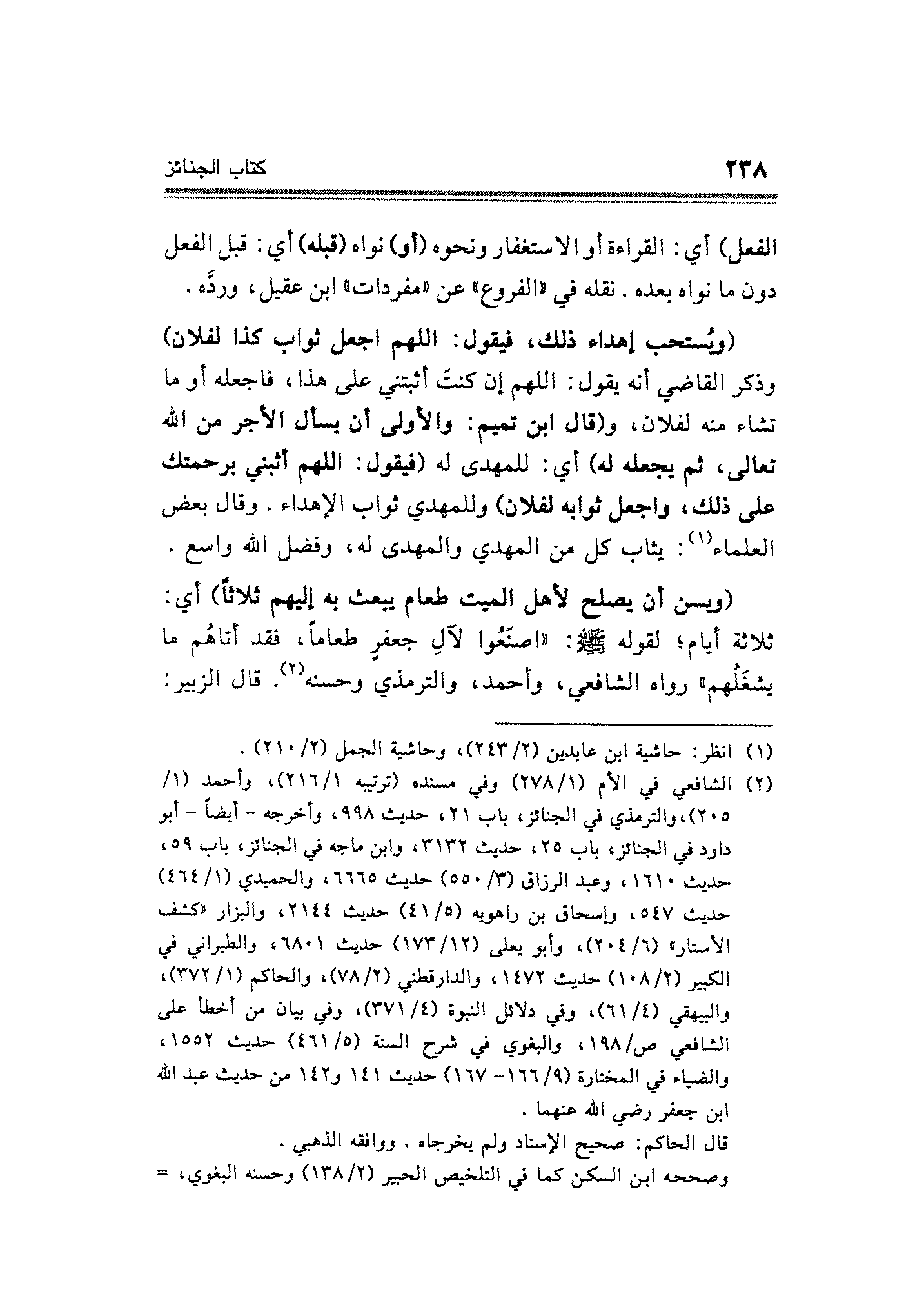 (ويسن أن يصلح لأهل الميت طعام يبعث به إليهم ثلاثًا) أى: ثلاثة أيام؛ لقوله - صلى الله عليه وسلم -: "اصنعَوا لآلِ جعفرٍ طعامًا، فقد أتاهُم ما يشْغَلُهم" رواه الشافعي، وأحمد، والترمذي وحسنه (¬٢). قال الزبير: