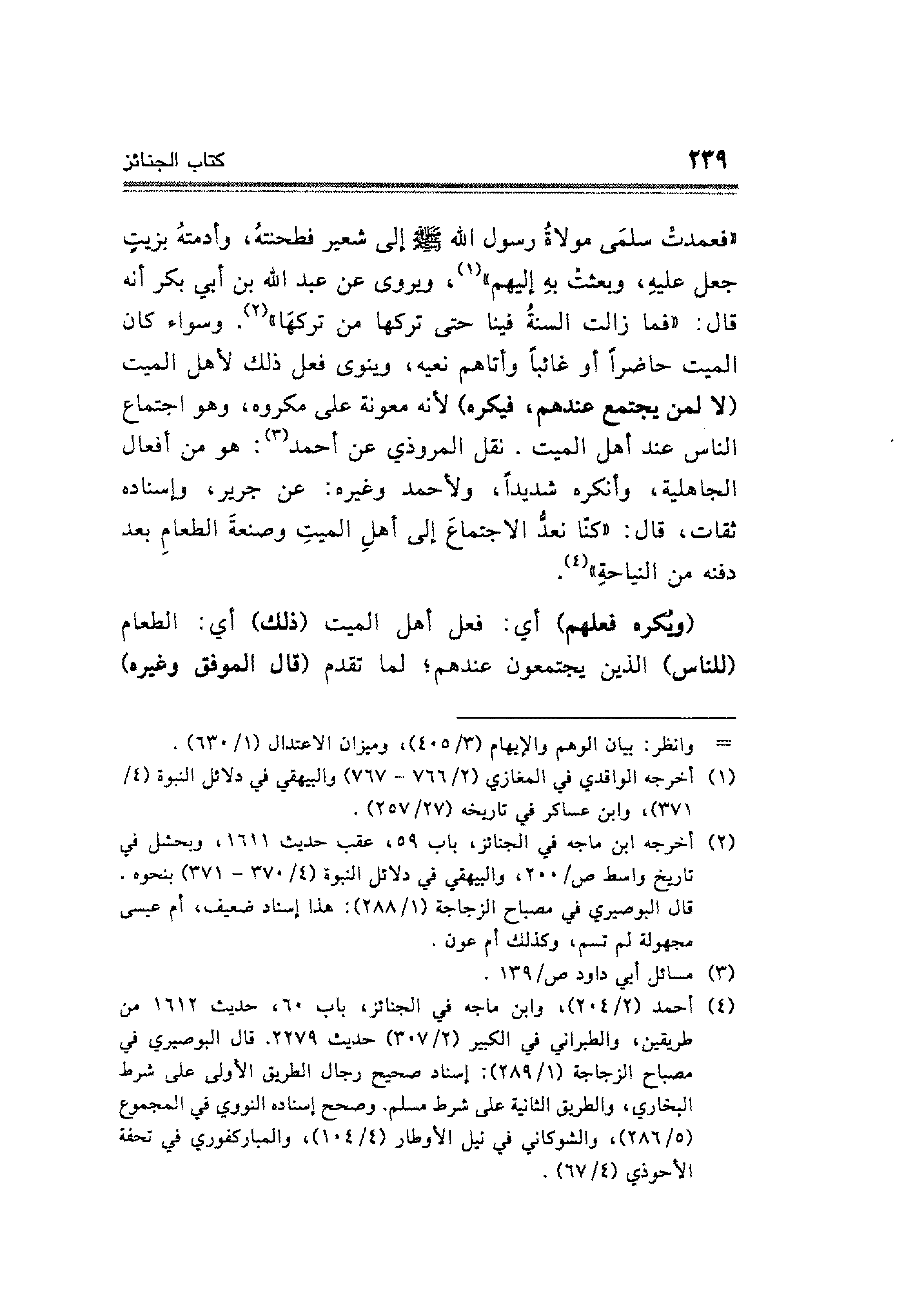 "فعمدت سلمَى مولاةُ رسول الله - صلى الله عليه وسلم - إلى شعير فطحنتهُ، وأدمتهُ بزيتٍ جعل عليهِ، وبعثت بهِ إليهم" (¬١)، ويروى عن عبد الله بن أبي بكر أنه قال: "فما زالت السنةُ فينا حتى تركها من تركهَا" (¬٢). وسواء كان الميت حاضرًا أو غائبًا وأتاهم نعيه، وينوى فعل ذلك لأهل الميت (لا لمن يجتمع عندهم، فيكره) لأنه معونة على مكروه، وهو اجتماع الناس عند أهل الميت. نقل المروذي عن أحمد (¬٣): هو من أفعال الجاهلية، وأنكره شديدًا، ولأحمد وغيره: عن جرير، وإسناده ثقات، قال: (كنا نعدُّ الاجتماعَ إلى أهلِ الميتِ وصنعةَ الطعامِ بعد دفنه من النياحةِ" (¬٤).