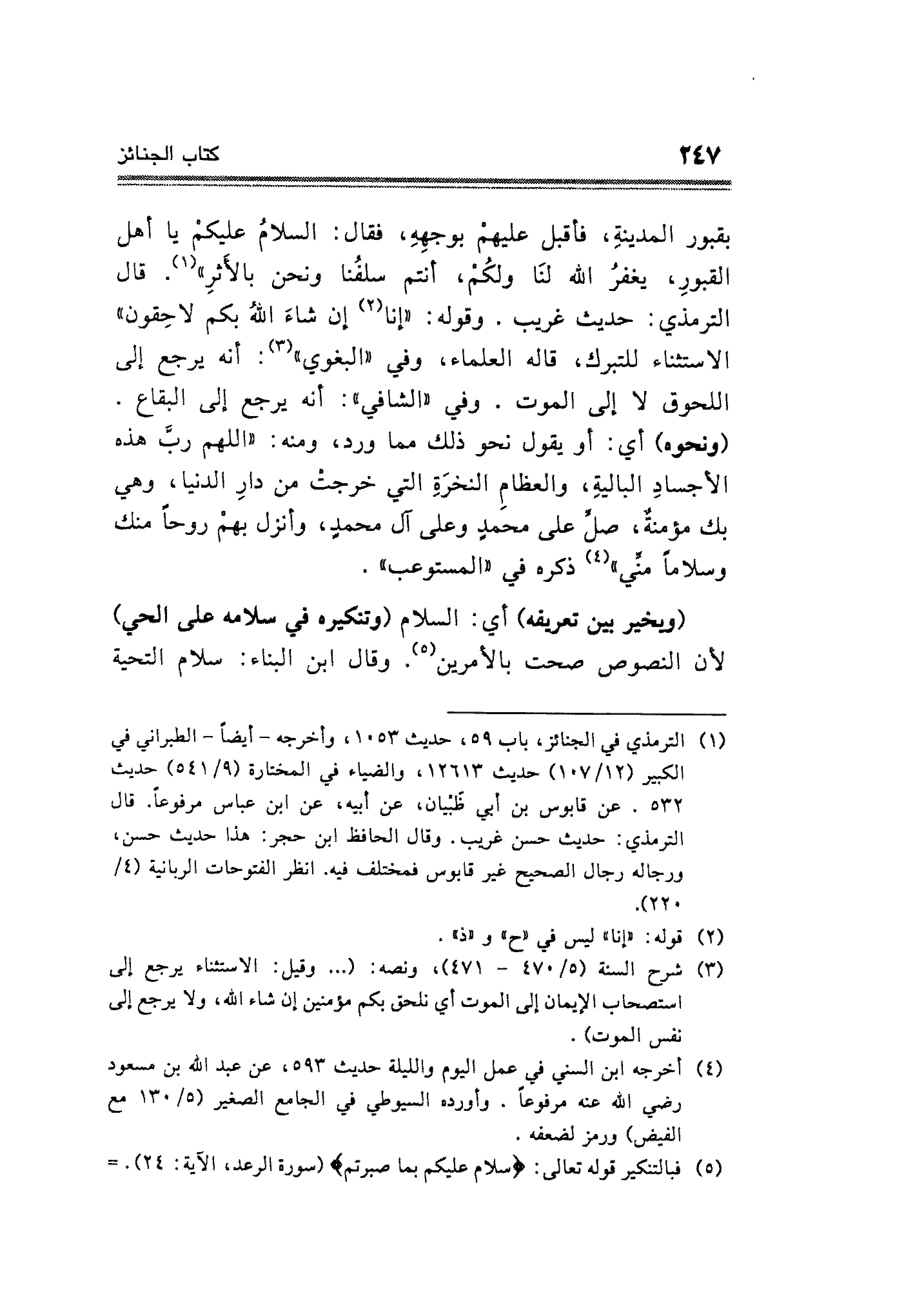 بقبور المدينةِ، فأقبل عليهمْ بوجههِ، فقال: السلام عليكم يا أهل القبورِ، يغفرُ الله لنَا ولكُم، أنتم سلفُنا ونحن بالأَثرِ" (¬١). قال الترمذي: حديث غريب. وقوله: "إنا (¬٢) إن شاءَ اللهُ بكم لاحِقون" الاستثناء للتبرك، قاله العلماء، وفي "البغوي" (¬٣): أنَّه يرجع إلى اللحوق لا إلى الموت. وفي "الشافي": أنَّه يرجع إلى البقاع. (ونحوه) أي: أو يقول نحو ذلك مما ورد، ومنه: "اللهم ربَّ هذه الأجسادِ الباليةِ، والعظامِ النخرَةِ التي خرجتْ من دارِ الدنيا، وهي بك مؤمنةٌ، صلِّ على محمدٍ وعلى آل محمدٍ، وأنزل بهمْ روحًا منك وسلامًا منِّى" (¬٤) ذكره في "المستوعب".