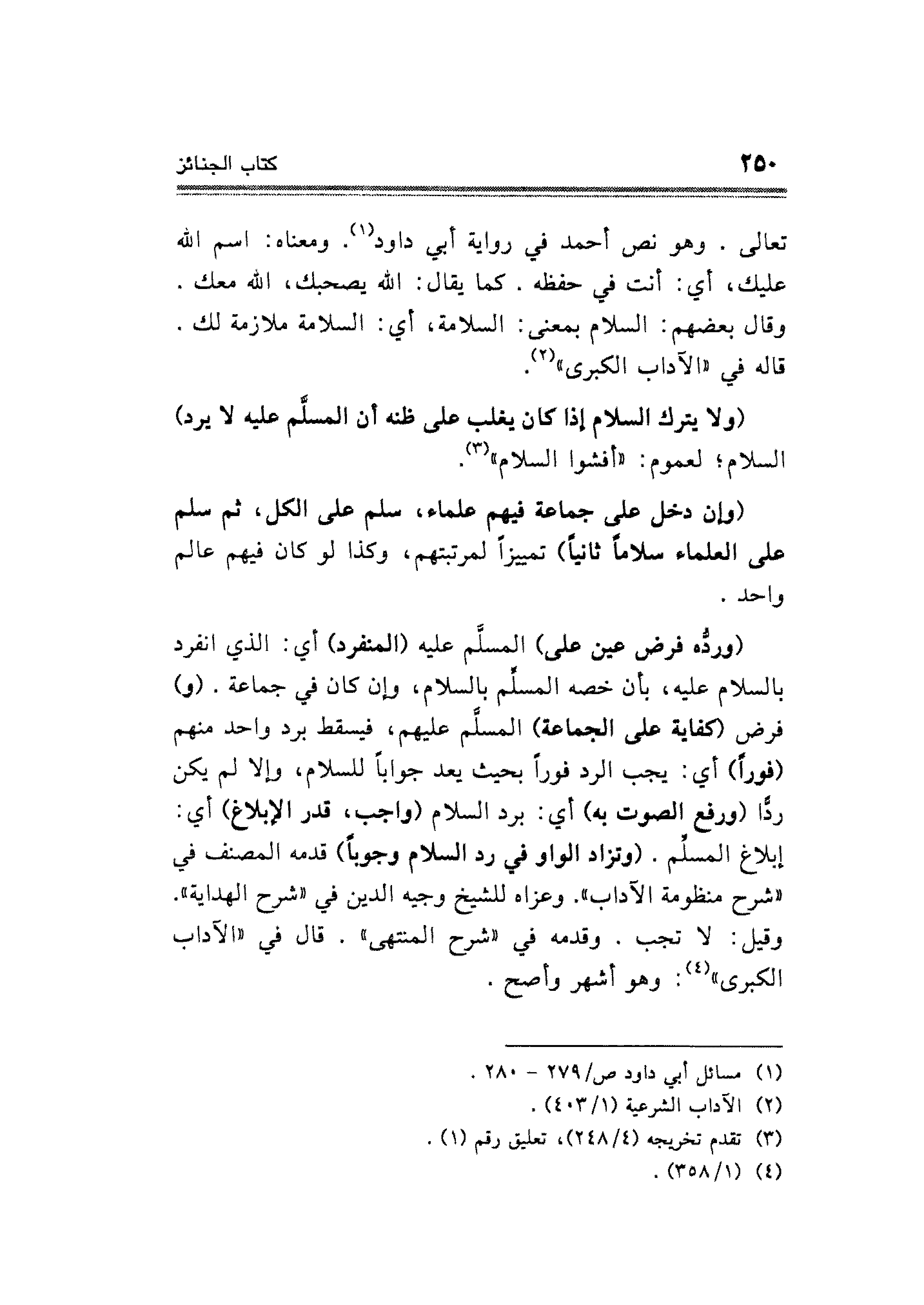 (وردُّه فرض عين على) المسلَّم عليه (المنفرد) أي: الَّذي انفرد بالسلام عليه، بأن خصه المسلَّم بالسلام، وإن كان في جماعة. (و) فرض (كفاية على الجماعة) المسلَّم عليهم؛ فيسقط برد واحد منهم (فورًا) أي: يجب الرد فورًا بحيث يعد جوابًا للسلام، وإلا لم يكن ردًّا (ورفع الصوت به) أي: برد السلام (واجب، قدر الإبلاغ) أي: إبلاغ المسلِّم، (وتزاد الواو في رد السلام وجوبًا) قدمه المصنف في "شرح منظومة الآداب". وعزاه للشيخ وجيه الدين في "شرح الهداية". وقيل: لا تجب. وقدمه في "شرح المنتهي". قال في "الآداب الكبرى" (¬٤): وهو أشهر وأصح.