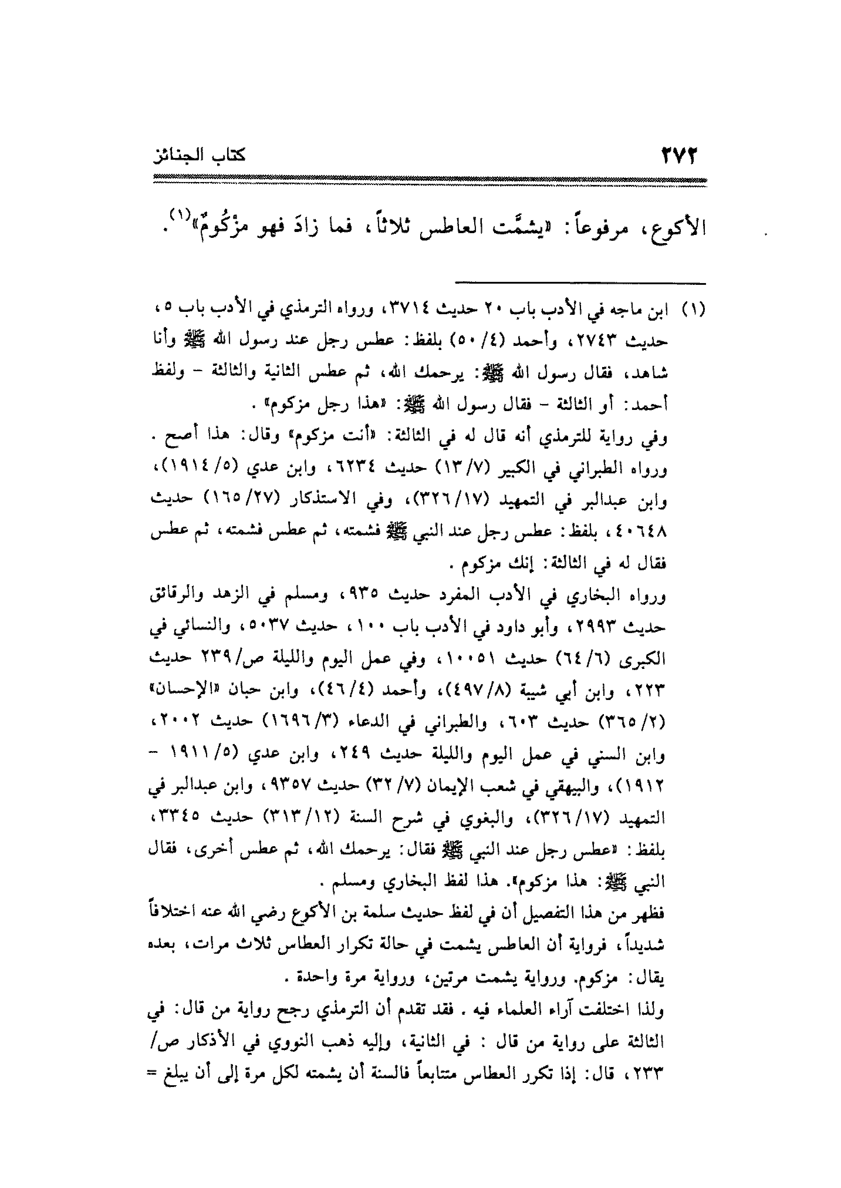 (¬١) ابن ماجه فى الأدب باب ٢٠ حديث ٣٧١٤، ورواه الترمذي في الأدب باب ٥، حديث ٢٧٤٣، وأحمد (٤/ ٥٠) بلفظ: عطس رجل عند رسول الله - صلى الله عليه وسلم - وأنا شاهد، فقال رسول الله - صلى الله عليه وسلم -: يرحمك الله، ثم عطس الثانية والثالثة - ولفظ أحمد: أو الثالثة - فقال رسول الله - صلى الله عليه وسلم -: "هذا رجل مزكوم".