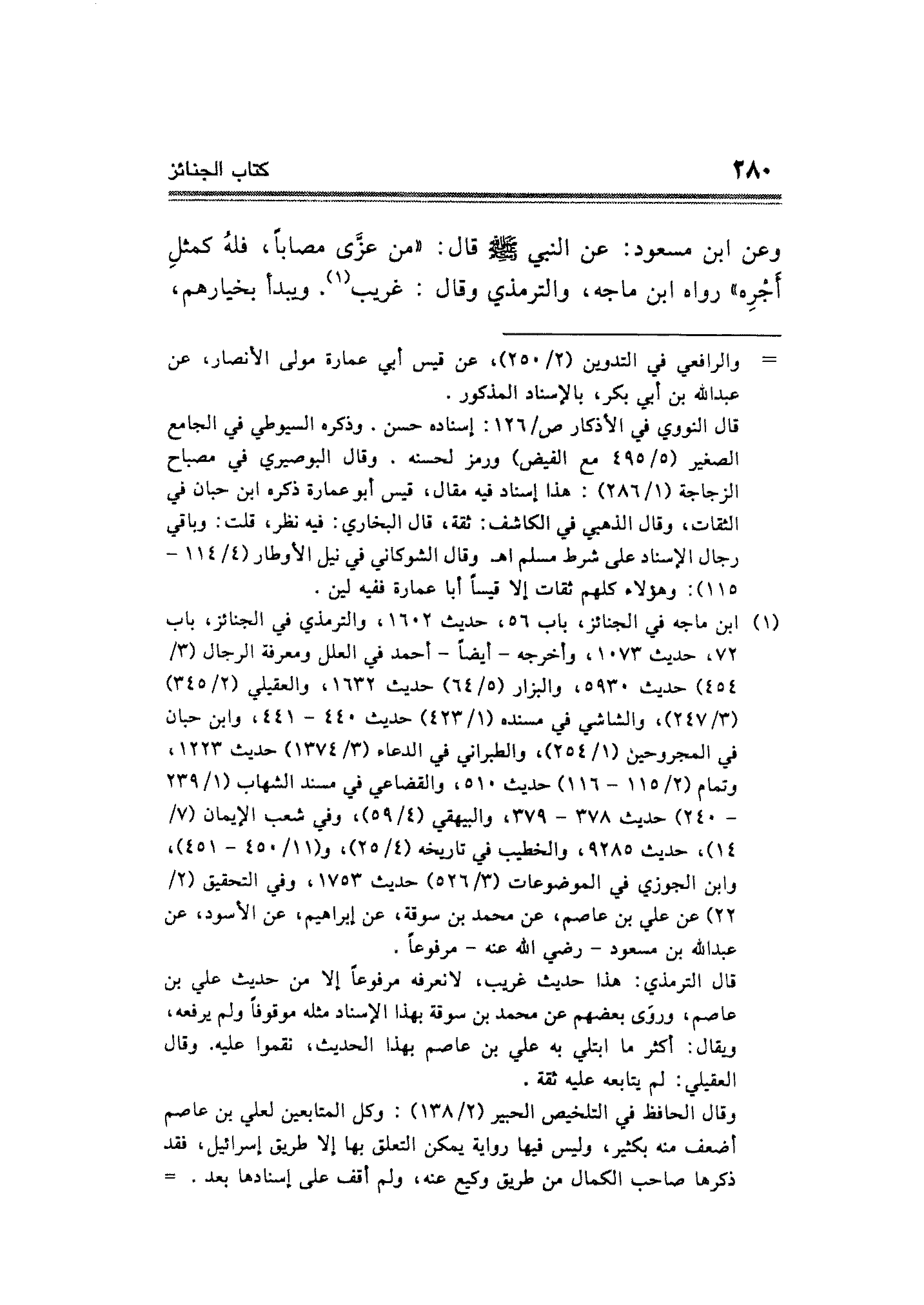 وعن ابن مسعود: عن النبي - صلى الله عليه وسلم - قال: "من عزَّى مصاباً، فلهُ كمثلِ أجْرِه" رواه ابن ماجه، والترمذي وقال: غريب (¬١). ويبدأ بخيارهم،