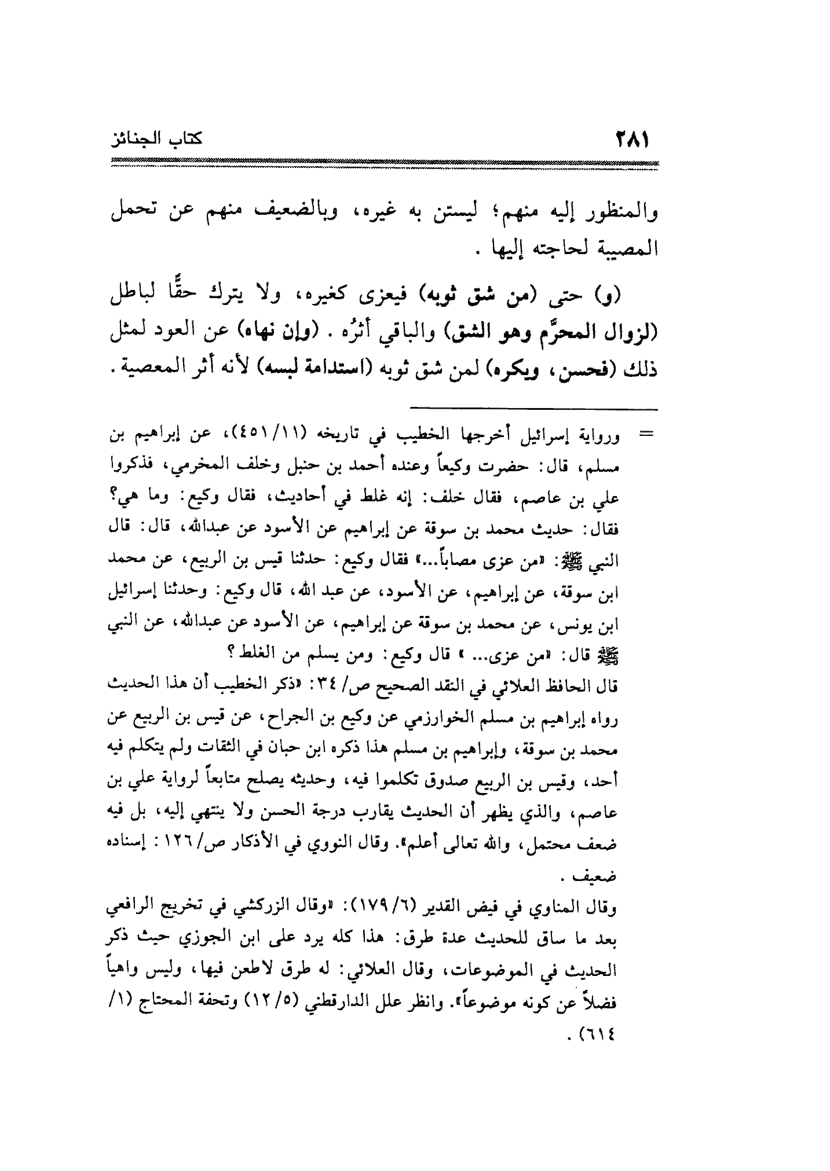 وقال المناوي في فيض القدير (٦/ ١٧٩): "وقال الزركشي في تخريج الرافعي بعد ما ساق للحديث عدة طرق: هذا كله يرد على ابن الجوزي حيث ذكر الحديث في الموضوعات، وقال العلائي: له طرق لا طعن فيها، وليس واهيًا فضلًا عن كونه موضوعًا". وانظر علل الدارقطني (٥/ ١٢) وتحفة المحتاج (١/ ٦١٤).
