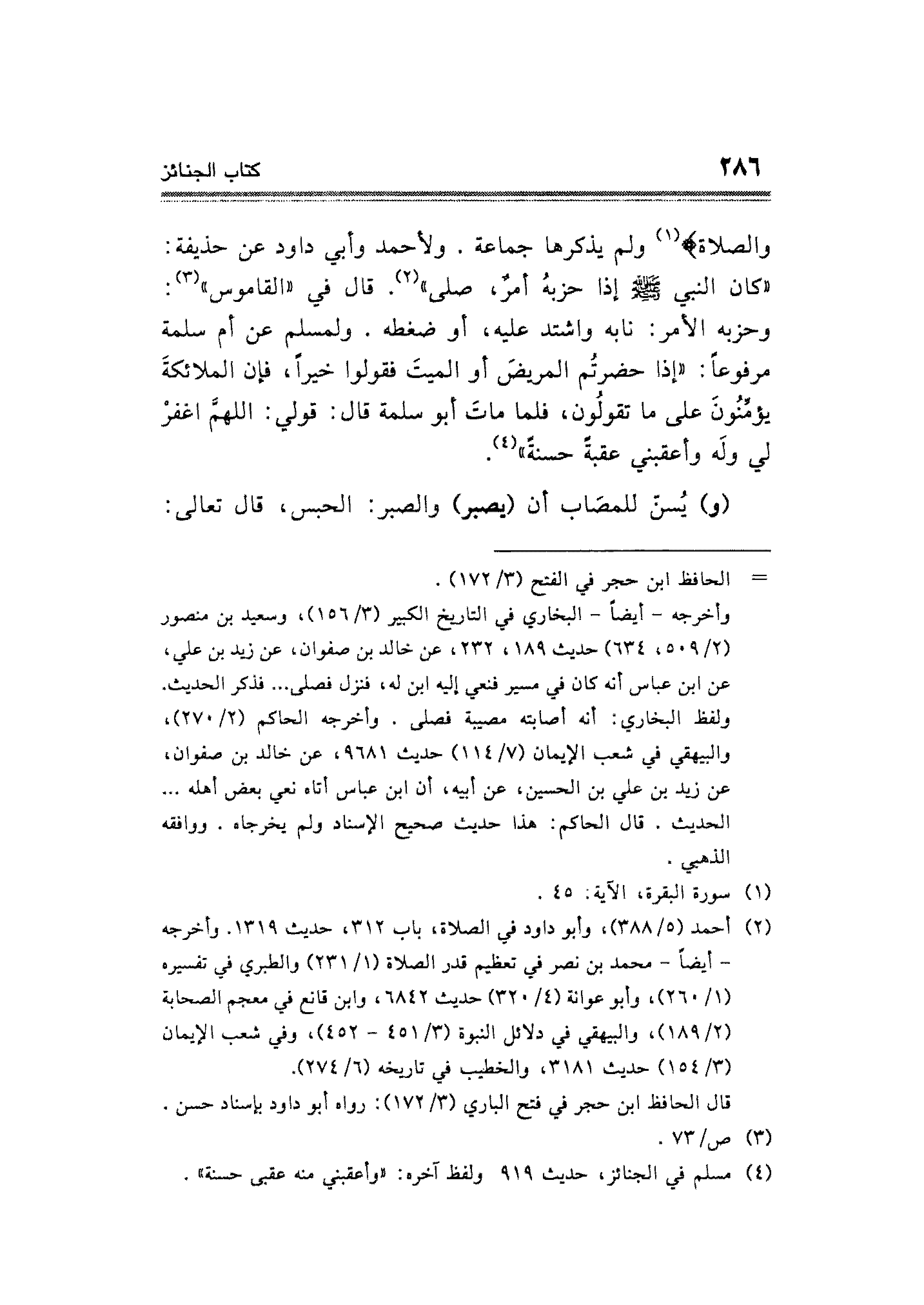 وَالصَّلَاةِ} (¬١) ولم يذكرها جماعة. ولأحمد وأبي داود عن حذيفة: "كان النبي - صلى الله عليه وسلم - إذا حزبهُ أمرٌ، صلى" (¬٢). قال في "القاموس" (¬٣): وحزبه الأمر: نابه واشتد عليه، أو ضغطه. ولمسلم عن أم سلمة مرفوعًا: "إذا حضرتُم المريضَ أو الميتَ فقولوا خيرًا، فإن الملائكةَ يؤمِّنُونَ على ما تقولُون، فلما ماتَ أبو سلمة قال: قولي: اللهمَّ اغفرْ لي ولَه وأعقبني عقبةً حسنةً" (¬٤).