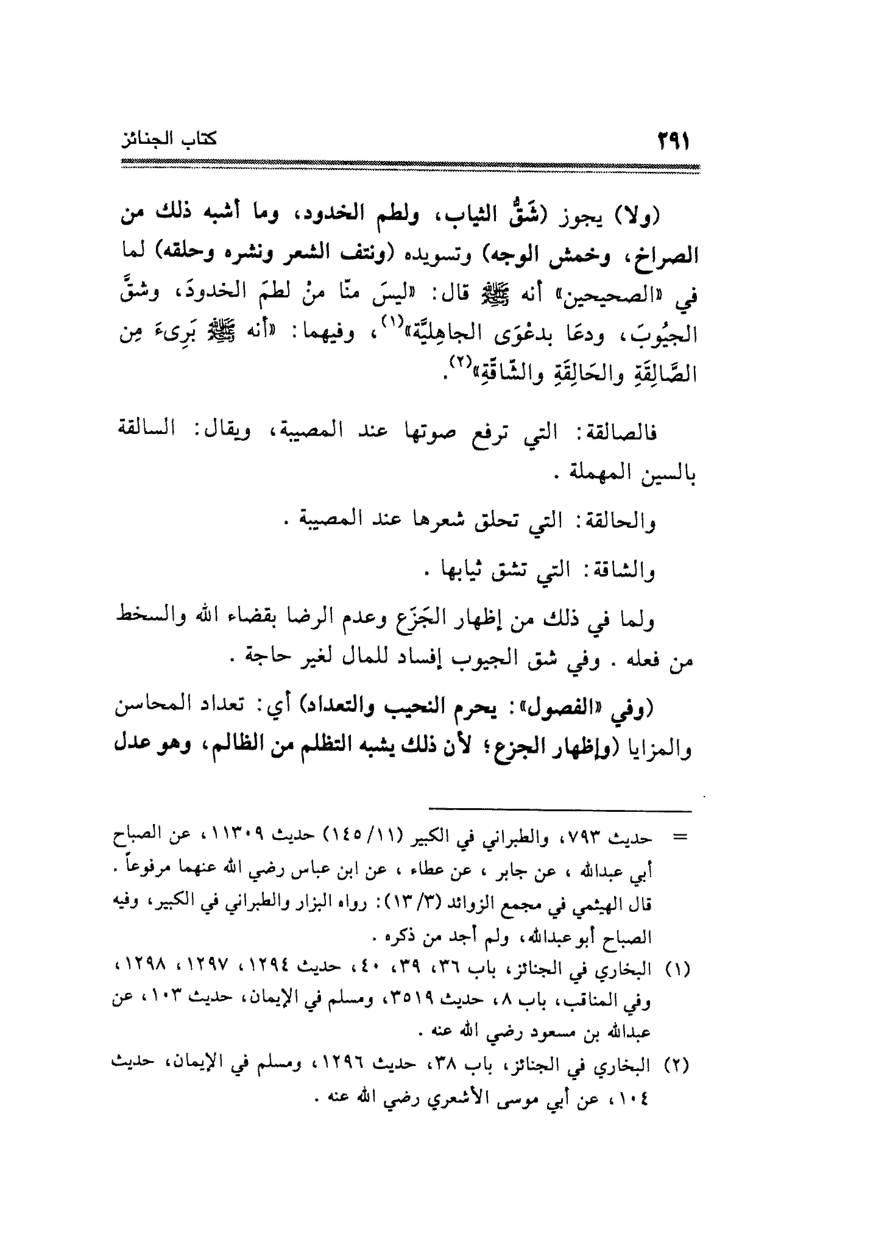 (وفي "الفصول": يحرم النحيب والتعداد) أي: تعداد المحاسن والمزايا (وإظهار الجزع؛ لأن ذلك يشبه التظلم من الظالم، وهو عدل