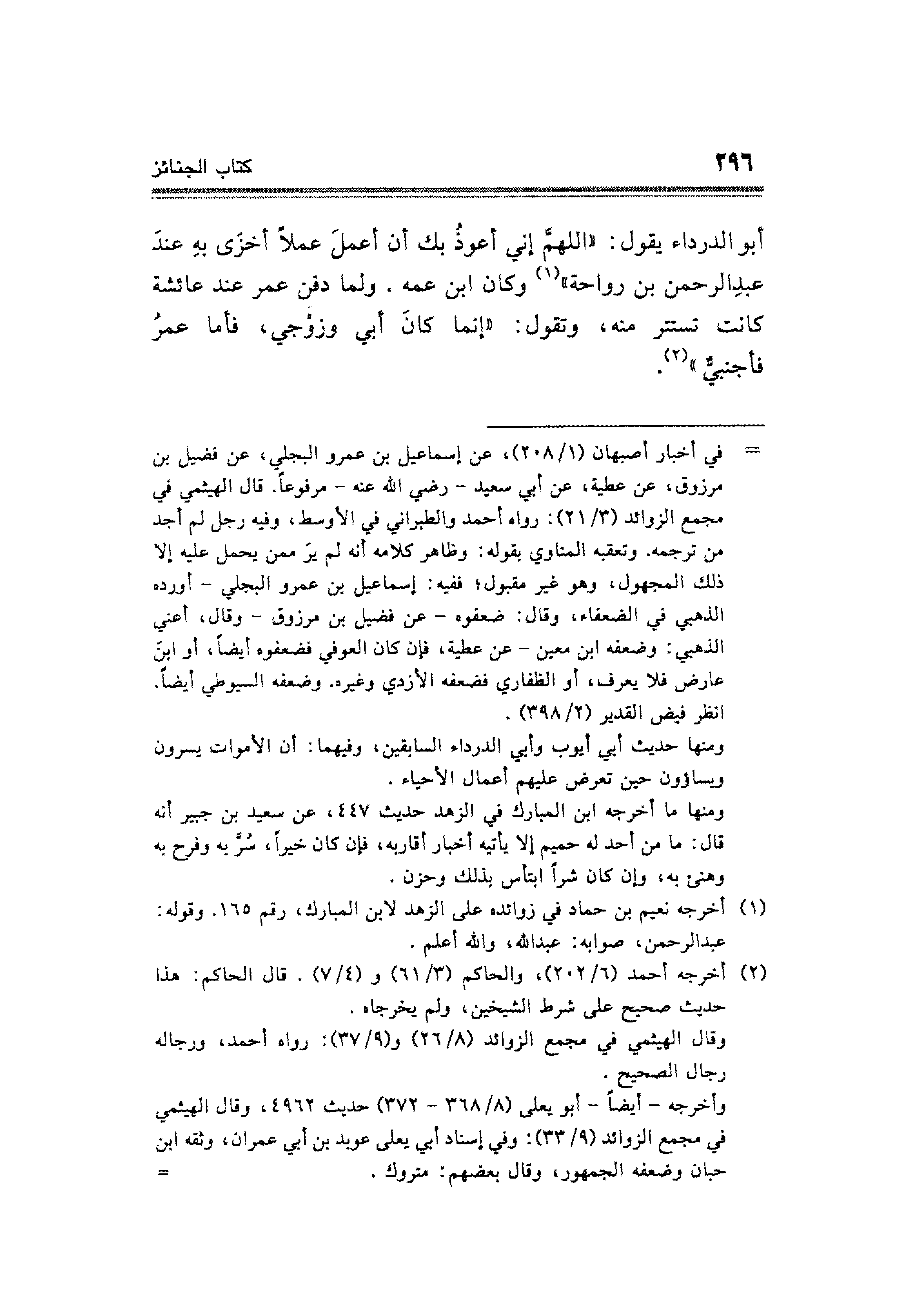 أبو الدرداء يقول: "اللهمَّ إني أعوذُ بك أن أعملَ عملًا أخزَى بهِ عندَ عبدِالرحمن بن رواحة" (¬١) وكان ابن عمه. ولما دفن عمر عند عائشة كانت تستتر منه، ويقول: "إنما كانَ أبي وزوجي، فأما عمرُ فأجنيٌّ" (¬٢).