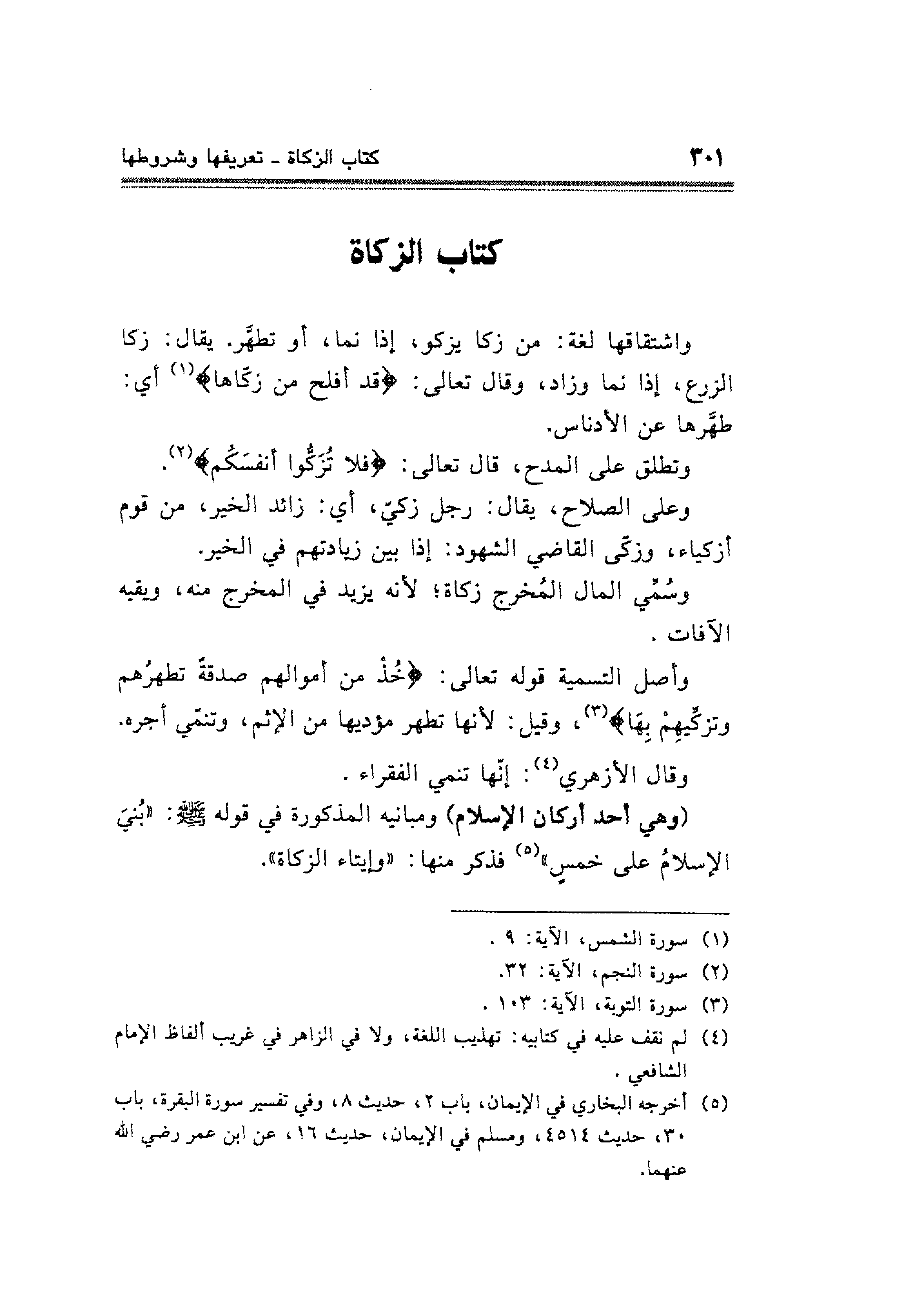 وأصل التسمية قوله تعالى: {خُذْ مِنْ أَمْوَالِهِمْ صَدَقَةً تُطَهِّرُهُمْ وَتُزَكِّيهِمْ بِهَا} (¬٣)، وقيل: لأنها تطهر مؤديها من الإثم، وتنمّي أجره.