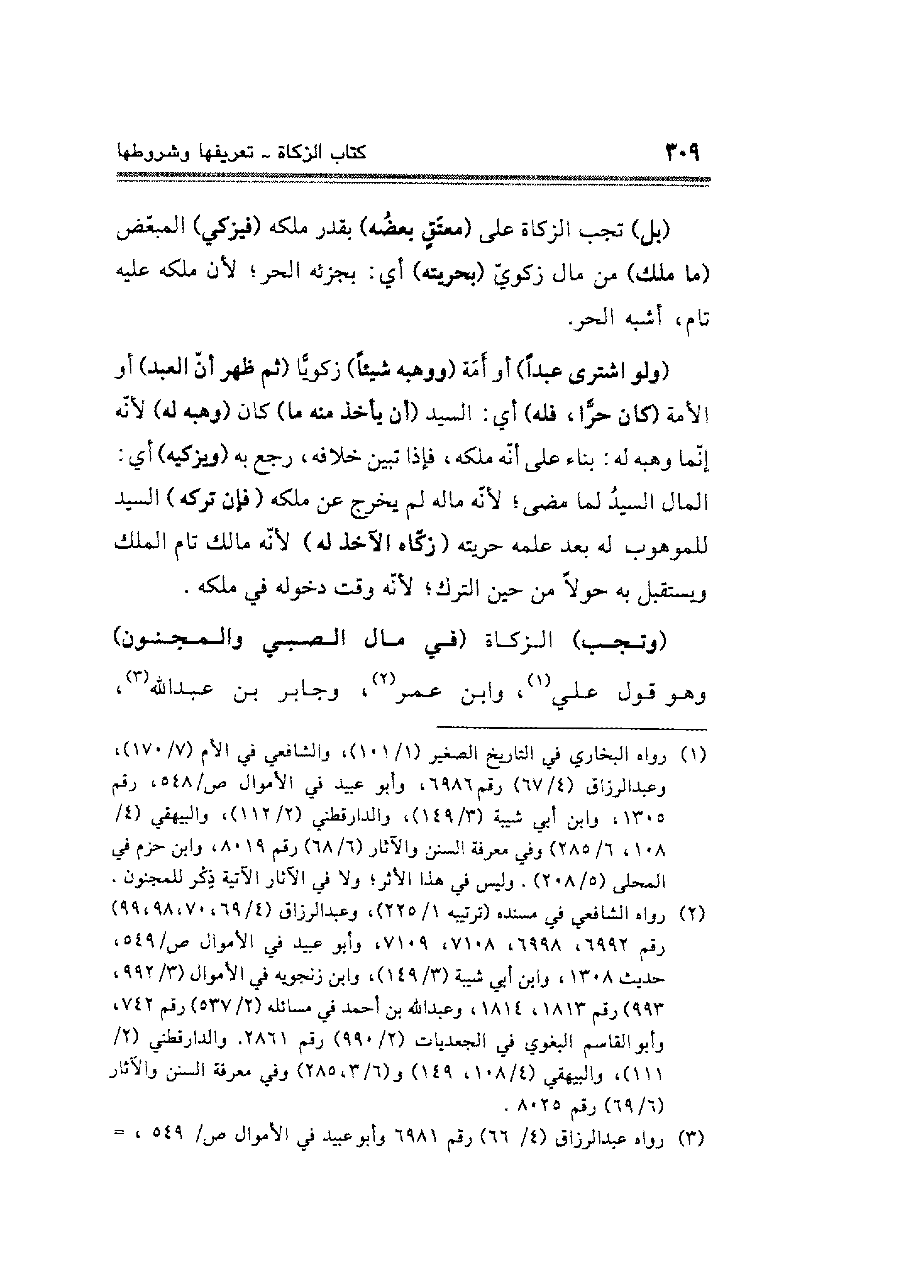 (¬١) رواه البخاري في التاريخ الصغير (١/ ١٠١)، والشافعي في الأم (٧/ ١٧٠)، وعبد الرزاق (٤/ ٦٧) رقم ٦٩٨٦، وأبو عبيد في الأموال ص / ٥٤٨، رقم ١٣٠٥، وابن أبي شيبة (٣/ ١٤٩)، والدارقطني (٢/ ١١٢)، والبيهقي (٤/ ١٠٨، ٦/ ٢٨٥) وفى معرفة السنن والآثار (٦/ ٦٨) رقم ٨٠١٩، وابن حزم في المحلى (٥/ ٢٠٨). وليس في هذا الأثر؛ ولا في الآثار الآتية ذِكْر للمجنون.