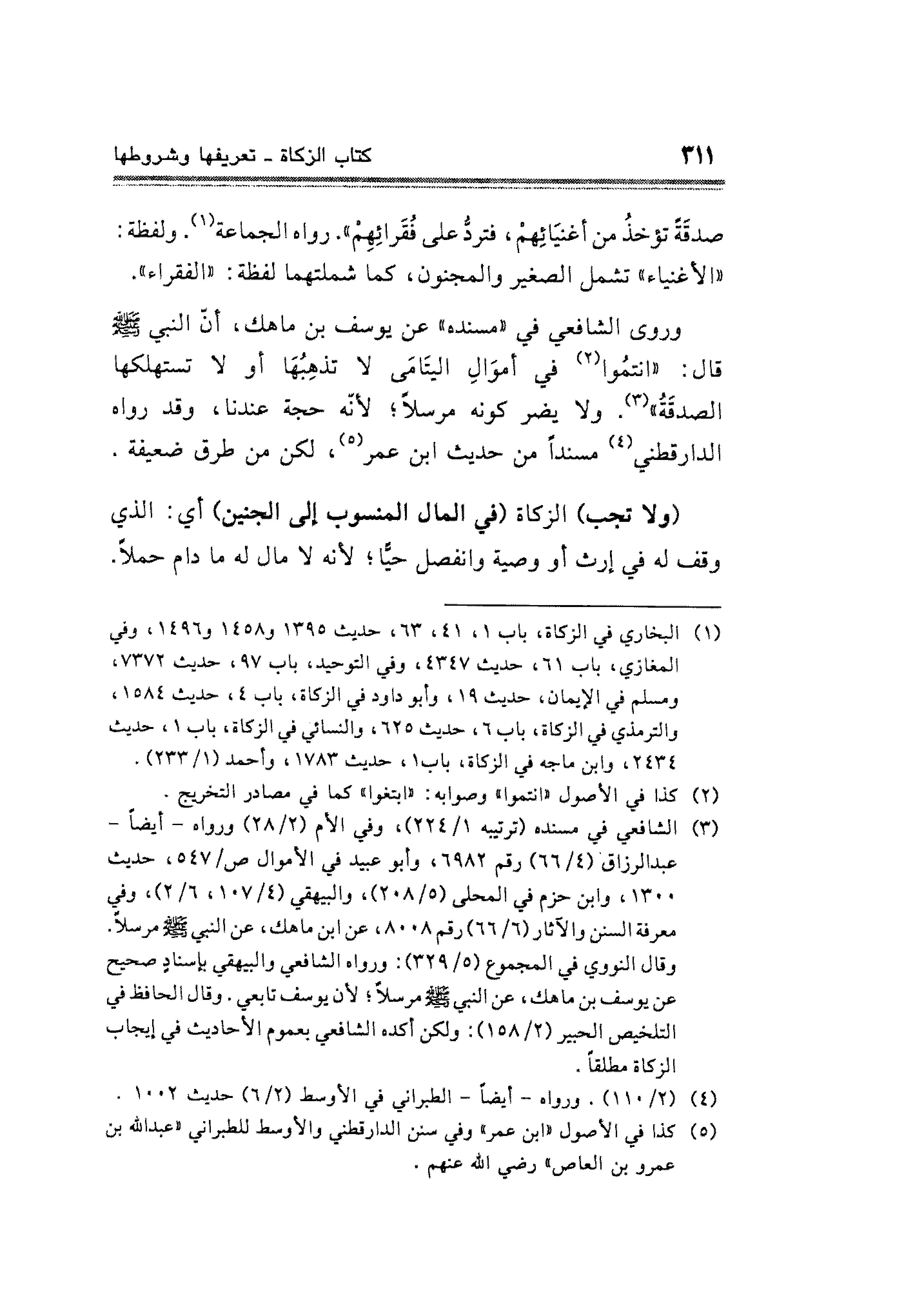وروى الشافعي في "مسنده" عن يوسف بن ماهك، أنّ النبي - صلى الله عليه وسلم - قال: "انتمُوا (¬٢) في أموَالِ اليتَامَى لا تذهِبُهَا أو لا تستهلكها الصدقَةُ" (¬٣). ولا يضر كونه مرسلًا؛ لأنّه حجة عندنا، وقد رواه الدارقطنى (¬٤) مسندًا من حديث ابن عمر (¬٥)، لكن من طرق ضعيفة.
