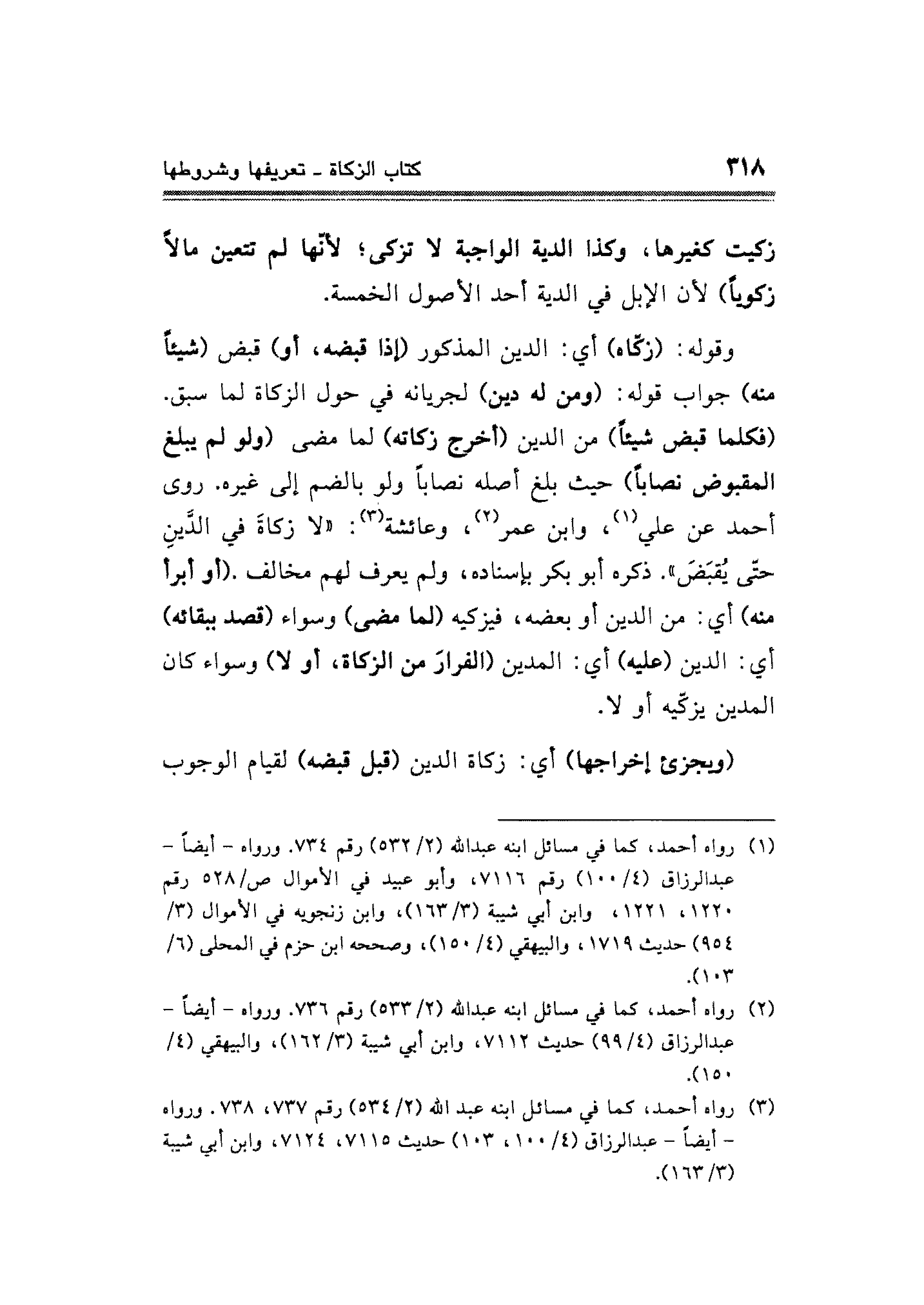 وقوله: (زكَّاه) أي: الدين المذكور (إذا قبضه، أو) قبض (شيئًا منه) جواب قوله: (ومن له دين) لجريانه في حول الزكاة لما سبق. (فكلما قبض شيئًا) من الدين (أخرج زكاته) لما مضى (ولو لم يبلغ المقبوض نصاباً) حيث بلغ أصله نصاباً ولو بالضم إلى غيره. روى أحمد عن علي (¬١)، وابن عمر (¬٢)، وعائشة (¬٣): "لا زكاةَ في الدينِ حتَّى يقبَضَ". ذكره أبو بكر بإسناده، ولم يعرف لهم مخالف. (أو أبرأ منه) أي: من الدين أو بعضه، فيزكيه (لما مضى) وسواء (قصد ببقائه) أي: الدين (عليه) أي: المدين (الفرارَ من الزكاة، أو لا) وسواء كان المدين يزكّيه أو لا.