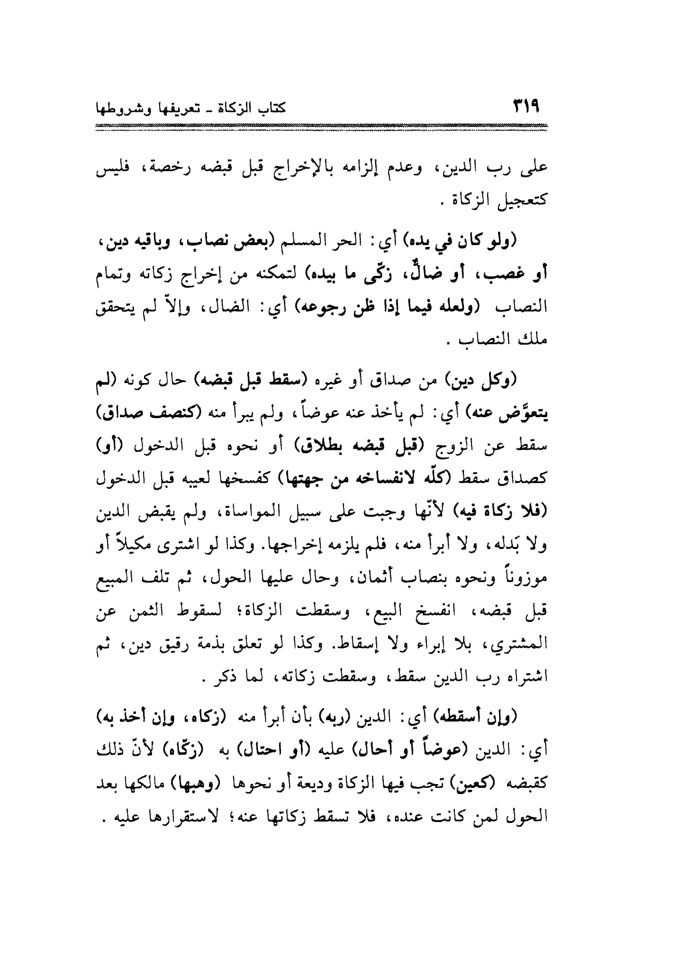 (وكل دين) من صداق أو غيره (سقط قبل قبضه) حال كونه (لم يتعوَّض عنه) أي: لم يأخذ عنه عوضًا، ولم يبرأ منه (كنصف صداق) سقط عن الزوج (قبل قبضه بطلاق) أو نحوه قبل الدخول (أو) كصداق سقط (كله لانفساخه من جهتها) كفسخها لعيبه قبل الدخول (فلا زكاة فيه) لأنها وجبت على سبيل المواساة، ولم يقبض الدين ولا بَدله، ولا أبرأ منه، فلم يلزمه إخراجها. وكذا لو اشترى مكيلاً أو موزونًا ونحوه بنصاب أثمان، وحال عليها الحول، ثم تلف المبيع قبل قبضه، انفسخ البيع، وسقطت الزكاة، لسقوط الثمن عن المشتري، بلا إبراء ولا إسقاط. وكذا لو تعلق بذمة رقيق دين، ثم اشتراه رب الدين سقط، وسقطت زكاته، لما ذكر.