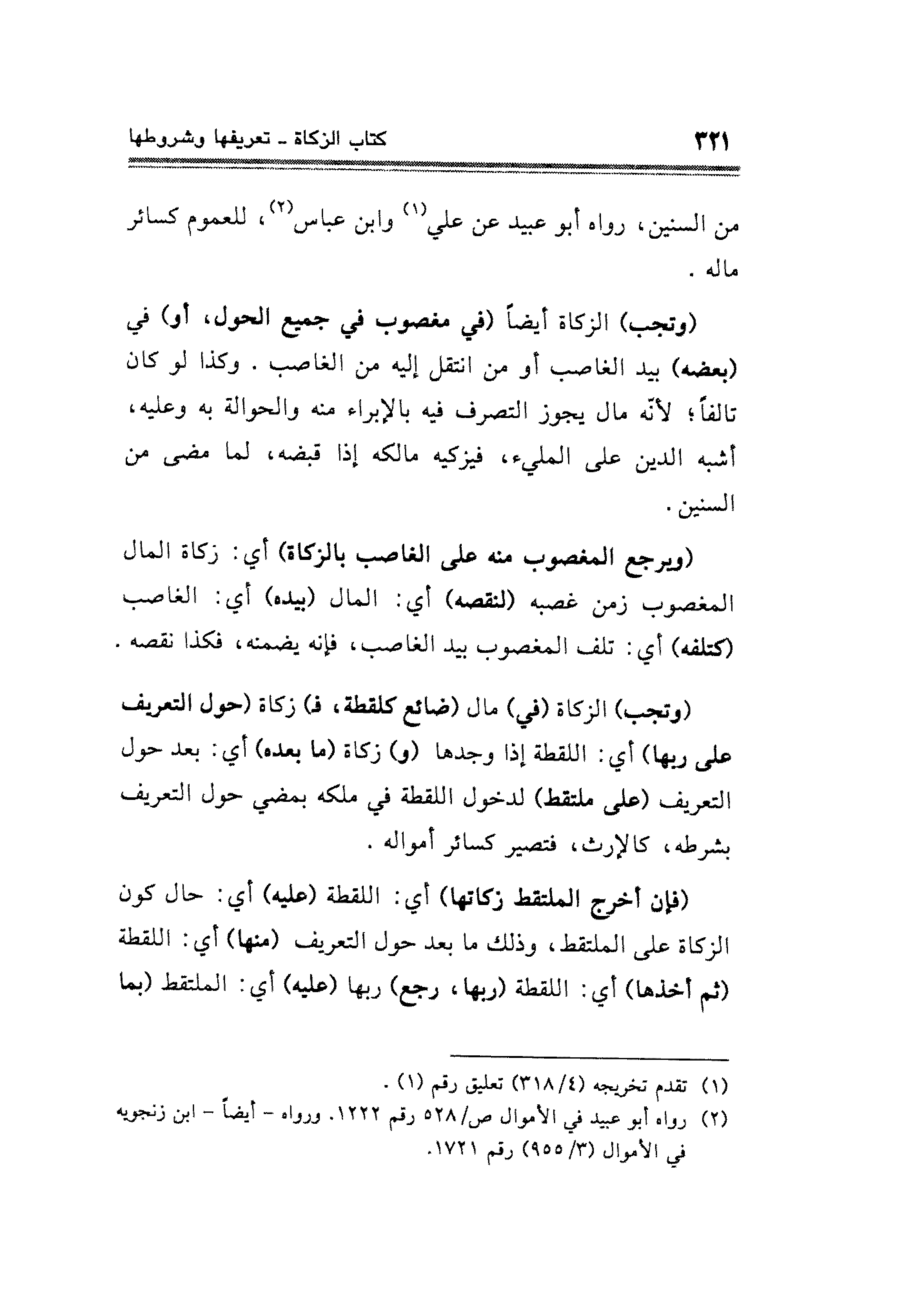 من السنين، رواه أبو عبيد عنْ علي (¬١) وابن عباس (¬٢)، للعموم كسائر ماله.