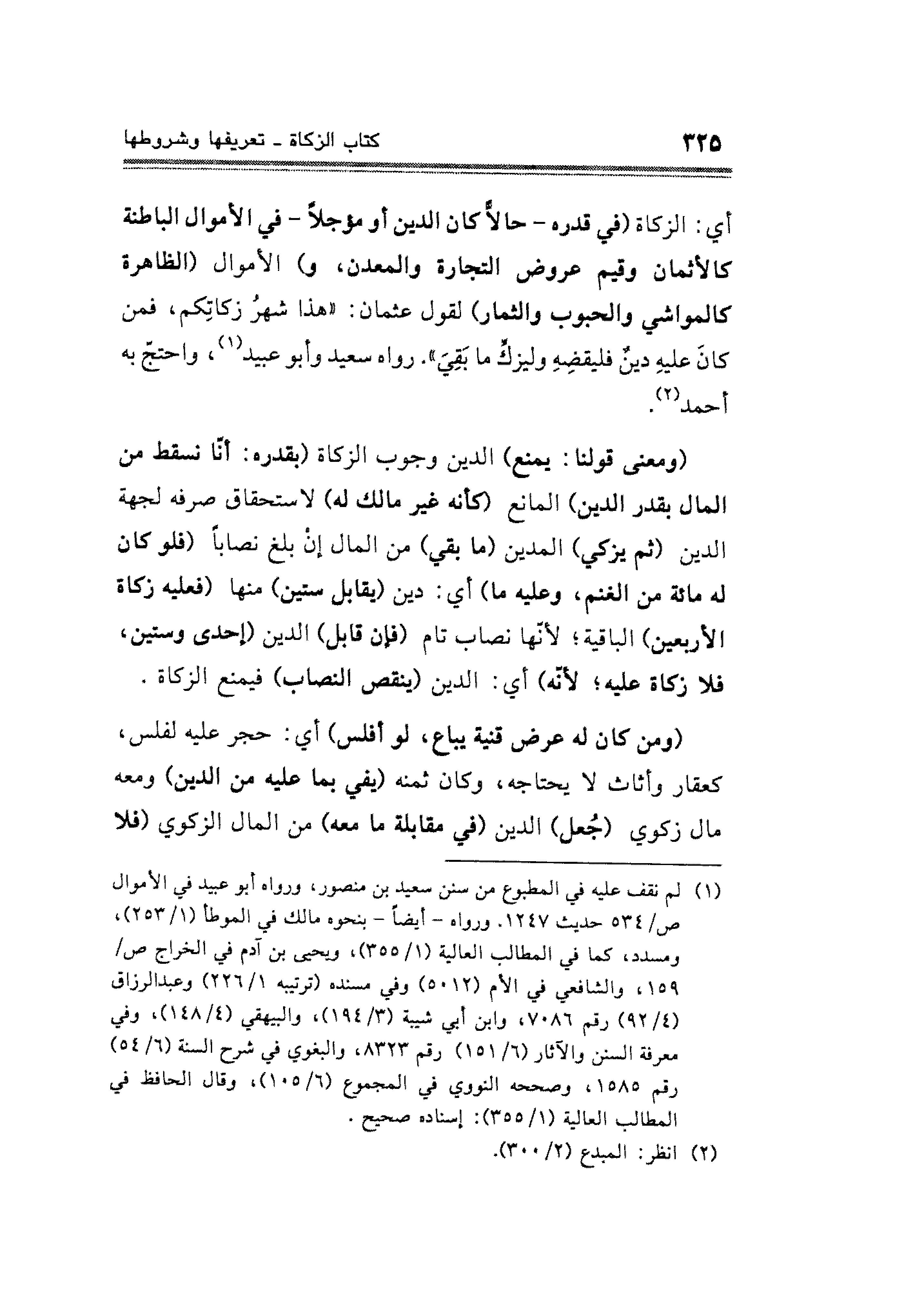 أي:) الزكاة (في قدره - حالاًّ كان الدين أو مؤجلاً - في الأموال الباطنة كالأثمان وقيم عروض التجارة والمعدن، و) الأموال (الظاهرة كالمواشي والحبوب والثمار) لقول عثمان: (هذا شهرُ زكاتِكم، فمن كانَ عليهِ دينٌ فليقضِهِ وليزكِّ ما بَقِيَ". رواه سعيد وأبو عبيد (¬١)، واحتجَّ به أحمد (¬٢).