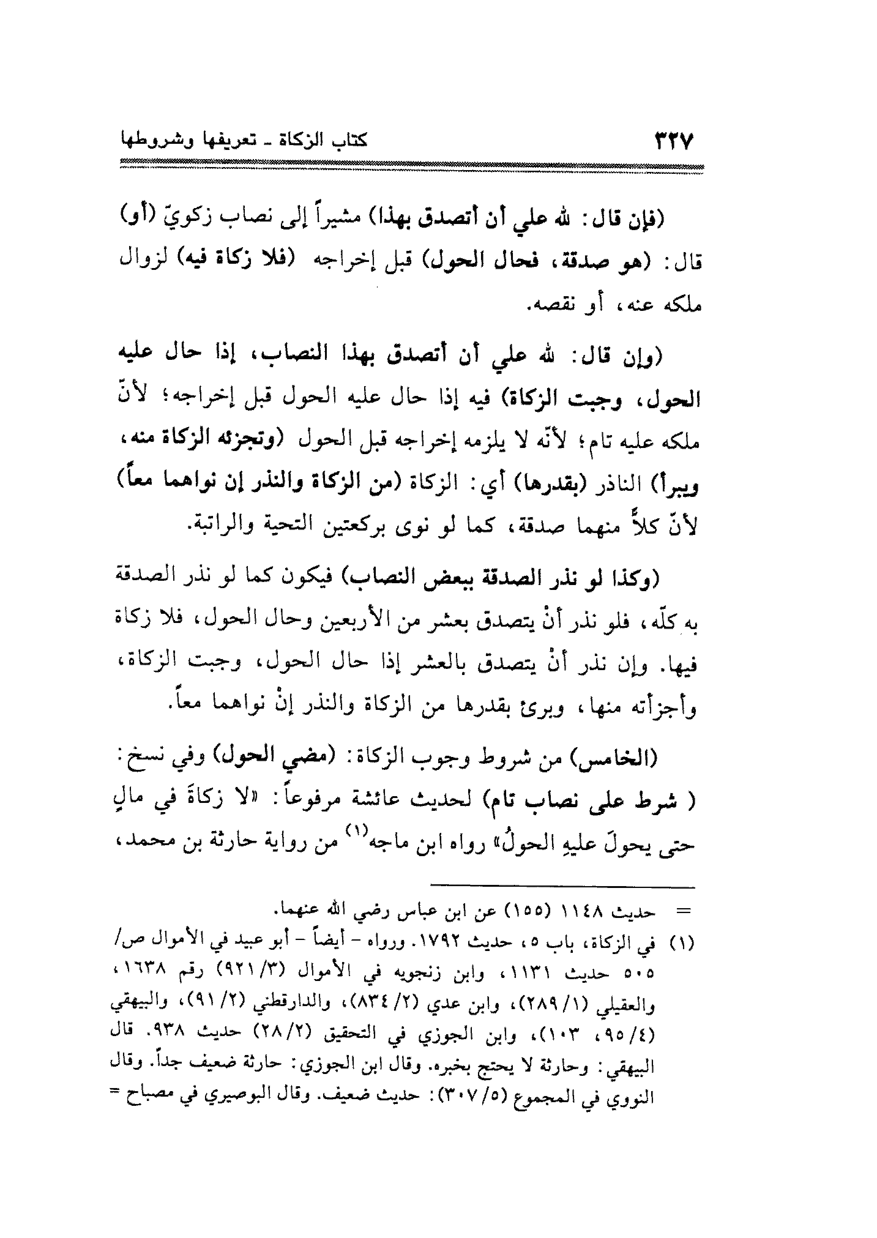 (الخامس) عن شروط وجوب الزكاة: (مضي الحول) وفي نسخ: (شرط على نصاب تام) لحديث عائشة مرفوعاً: "لا زكاة في مالٍ حتى يحولَ عليهِ الحول رواه ابن ماجه (¬١) من رواية حارثة بن محمد،