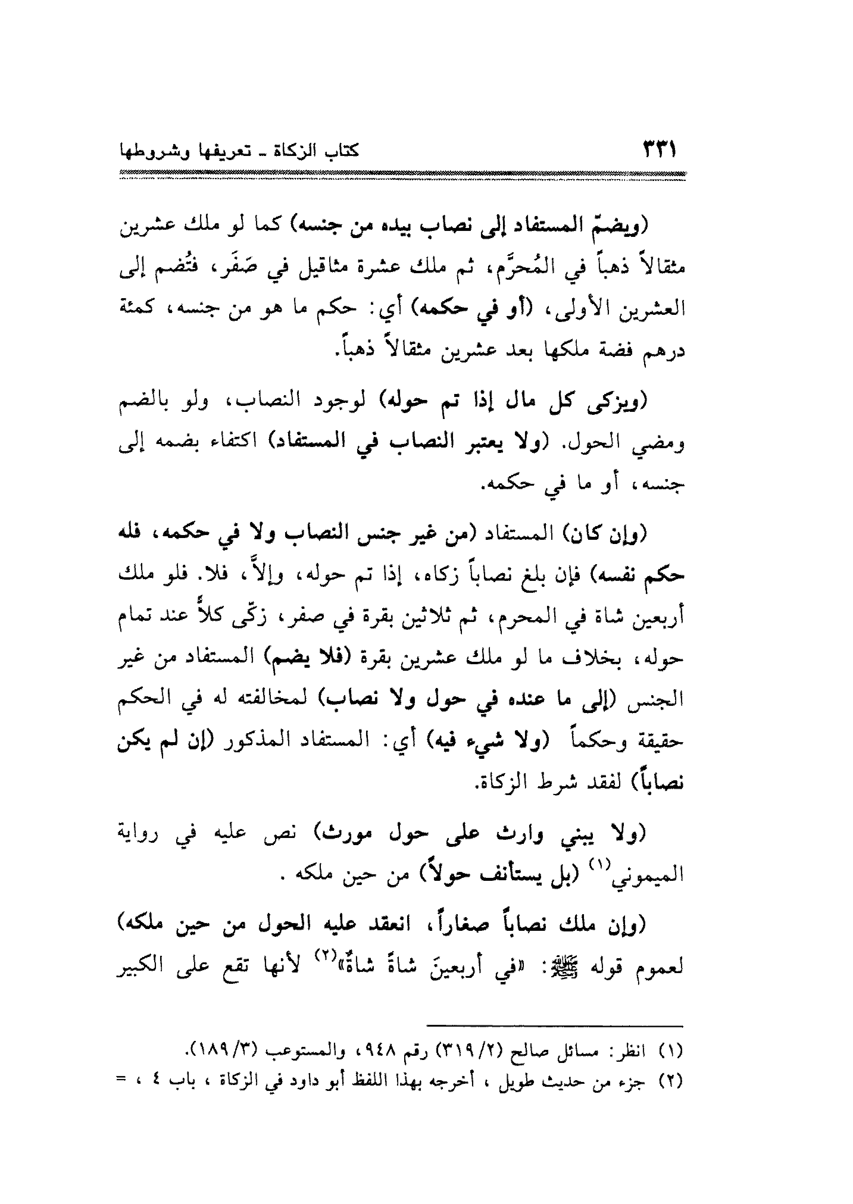 (ويضمَّ المستفاد إلى نصاب بيده من جنسه) كما لو ملك عشرين مثقالاً ذهباً في المُحرَّم، ثم ملك عشرة مثاقيل في صَفَر، فتُضم إلى العشرين الأولى، (أو في حكمه) أي: حكم ما هو من جنسه، كمئة درهم فضة ملكها بعد عشرين مثقالاً ذهباً.