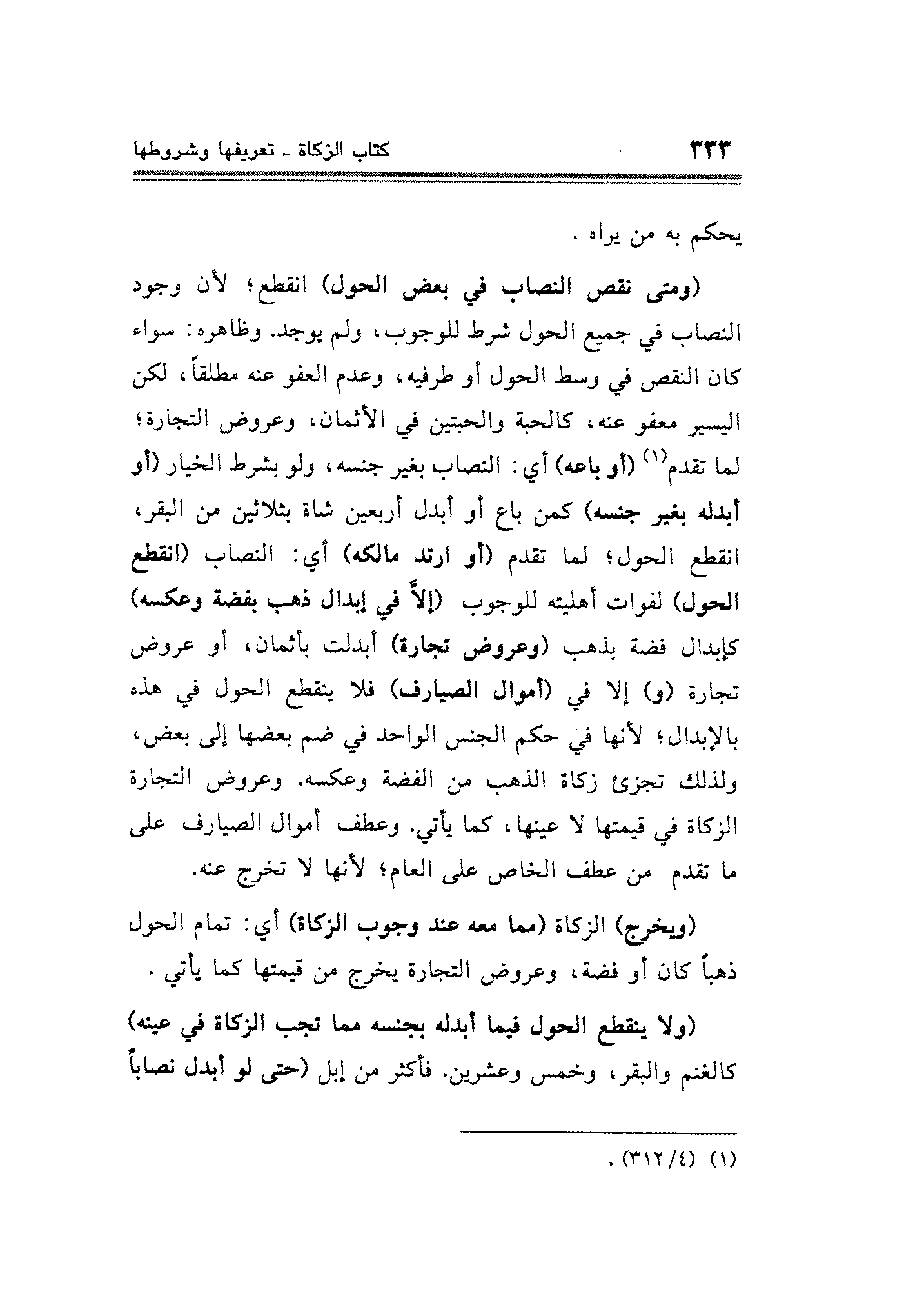 (ومتى نقص النصاب في بعض الحول) انقطع، لأن وجود النصاب في جمعِ الحول شرط للوجوب، ولم يوجد. وظاهره: سواء كان النقص في وسط الحول أو طرفيه، وعدم العفو عنه مطلقاً، لكن اليسير معفو عنه، كالحبة والحبتين في الأثمان، وعروض التجارة، لما تقدم (¬١) (أو باعه) أي: النصاب بغير جنسه، ولو بشرط الخيار (أو أبدله بغير جنسه) كمن باع أو أبدل أربعين شاة ثلاثين من البقر، انقطع الحول، لما تقدم (أو ارتد مالكه) أي: النصاب (انقطع الحول) لفوات أهليته للوجوب (إلَاّ في إبدال ذهب بفضة وعكسه) كإبدال فضة بذهب (وعروض تجارة) أبدلت بأثمان، أو عروض تجارة (و) إلا في (أموال الصيارف) فلا ينقطع الحول في هذه بالإبدال، لأنها في حكم الجنس الواحد في ضم بعضها إلى بعض، ولذلك تجزئ زكاة الذهب من الفضة وعكسه. وعروض التجارة الزكاة في قيمتها لا عينها، كما يأتي. وعطف أموال الصيارف على ما تقدم من عطف الخاص على العام، لأنها لا تخرج عنه.