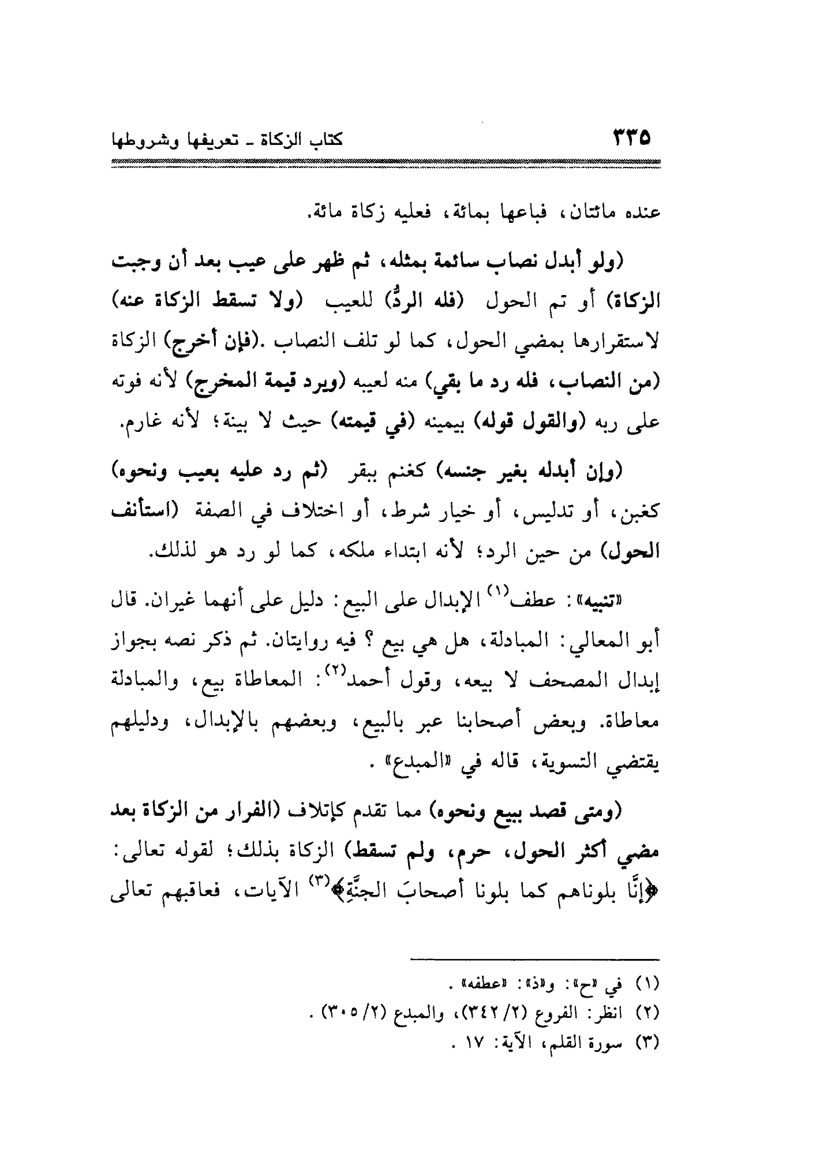 (ومتى قصد بيع ونحوه) مما تقدم كإتلاف (الفرار من الزكاة بعد مضي أكثر الحول، حرم، ولم تسقط) الزكاة بذلك، لقوله تعالى: {إِنَّا بَلَوْنَاهُمْ كَمَا بَلَوْنَا أَصْحَابَ الْجَنَّةِ} (¬٣) الآيات، فعاقبهم تعالى