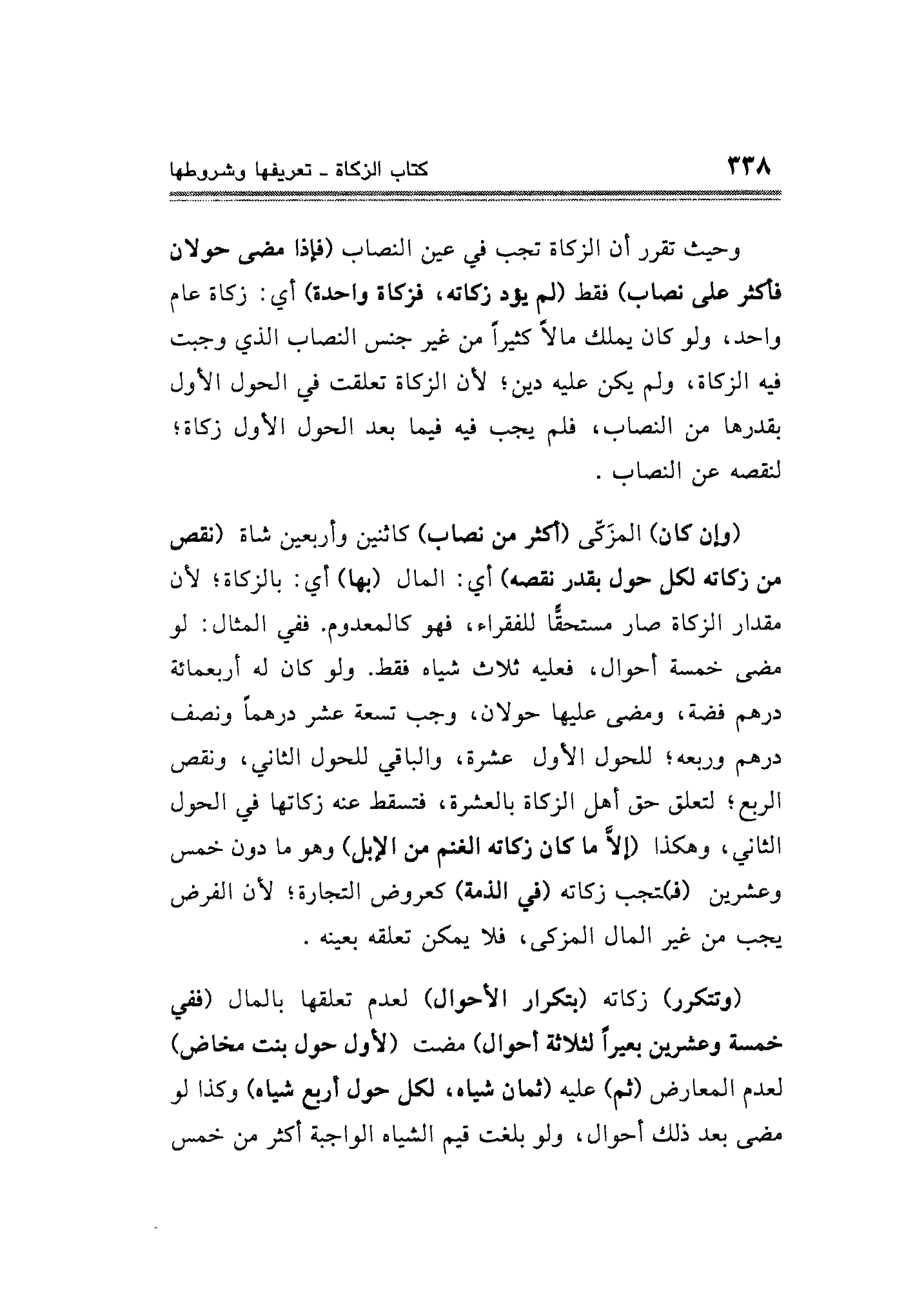 (وإن كان) المزَكّى (أكثر عن نصاب) كاثنين وأربعين شاة (نقص من زكاته لكل حول يقدر نقصه) أي: المال (بها) أي: بالزكاة، لأن مقدار الزكاة صار مستحقًّا للفقراء، فهو كالمعدوم. ففي المثال: لو مضى خمسة أحوال، فعليه ثلاث شياه فقط. ولو كان له أربعمائة درهم فضة، ومضى عليها حولان، وجب تسعة عشر درهماً ونصف درهم وربعه، للحول الأول عشرة، والباقي للحول الثاني ونقص الربع، لتعلق حق أهل الزكاة بالعشرة، فتسقط معه زكاتها في الحول الثاني، وهكذا (إلَاّ ما كان زكاته الغنم من الإبل) وهو ما دون خمس وعشرين (فـ) ـتجب زكاته (في الذمة) كعروض التجارة، لأن الفرض يجب من غير المال المزكى، فلا يمكن تعلقه بعينه.