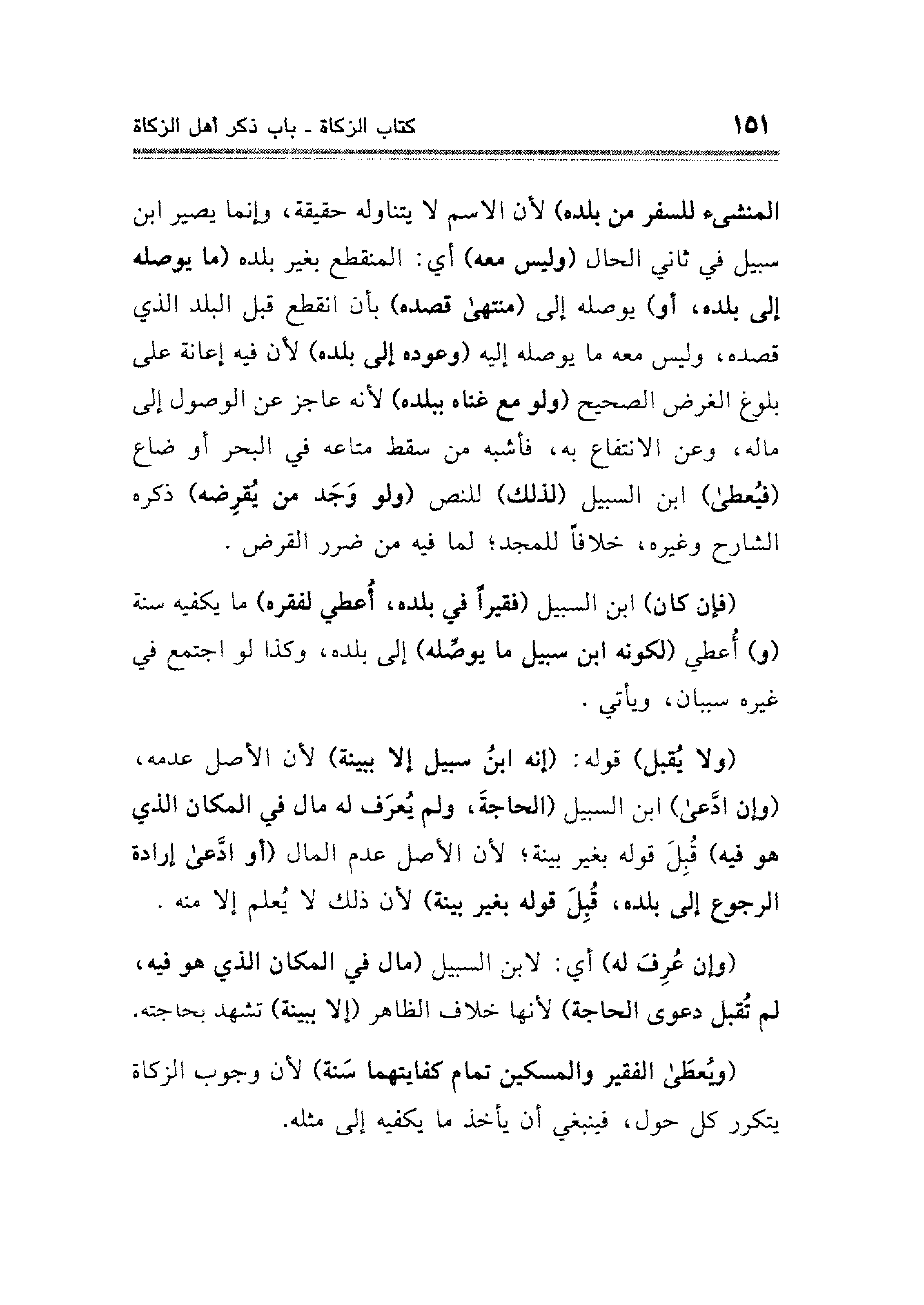 (ولا يُقبل) قوله: (إنه ابنُ سبيل إِلا ببينة) لأن الأصل عدمه، (وإن ادَّعى) ابن السبيل (الحاجةَ، ولم يُعرف له مال في المكان الذي هو فيه) قُبِلَ قوله بغير بينة؛ لأن الأصل عدم المال (أو ادَّعى إرادة الرجوع إلى بلده، قُبِلَ قوله بغير بينة) لأن ذلك لا يُعلم إلا منه.
