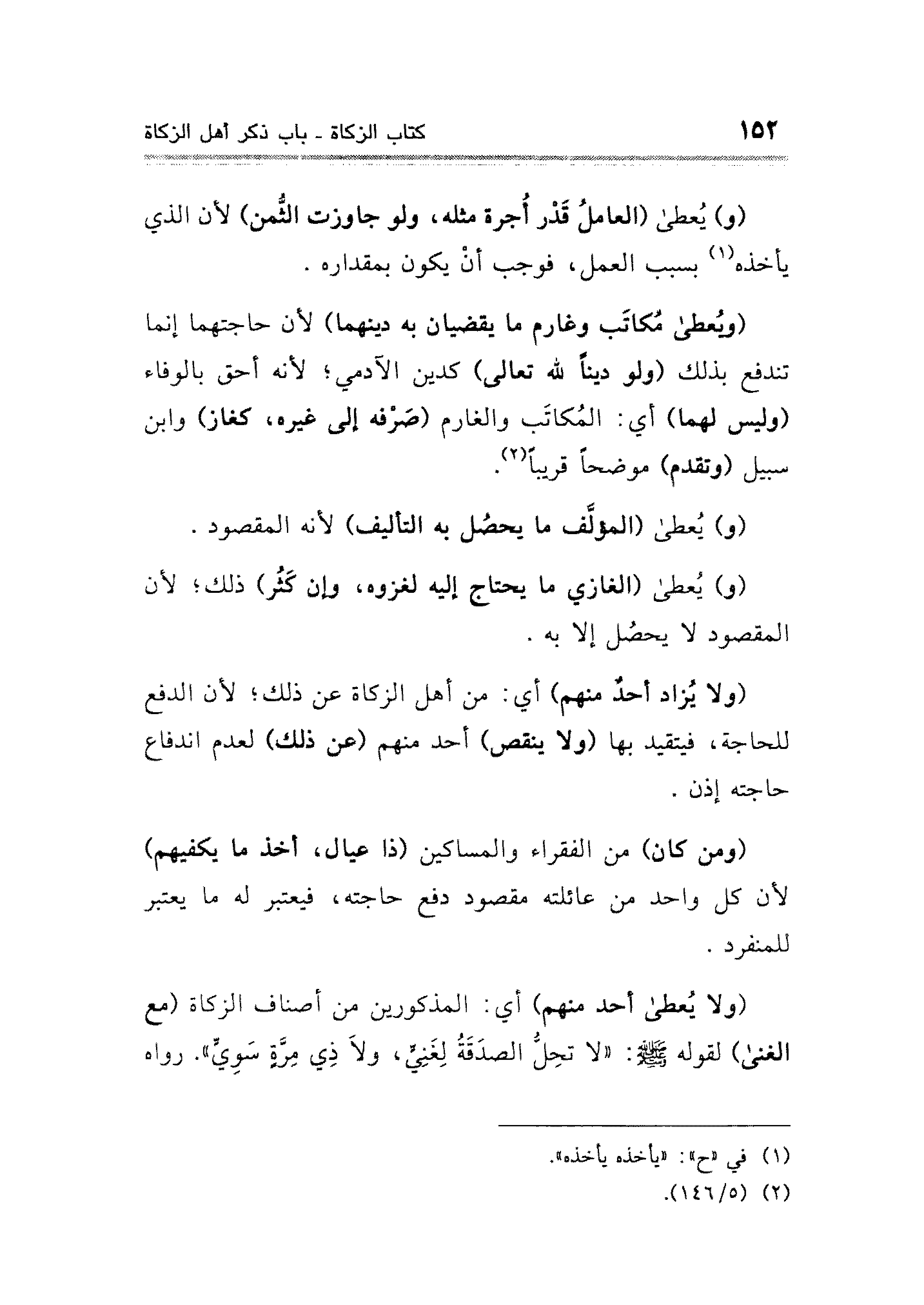 (ولا يُزاد أحدٌ منهم) أي: من أهل الزكاة عن ذلك؛ لأن الدفع للحاجة، فيتقيد بها (ولا ينقص) أحد منهم (عن ذلك) لعدم اندفاع حاجته إذن.