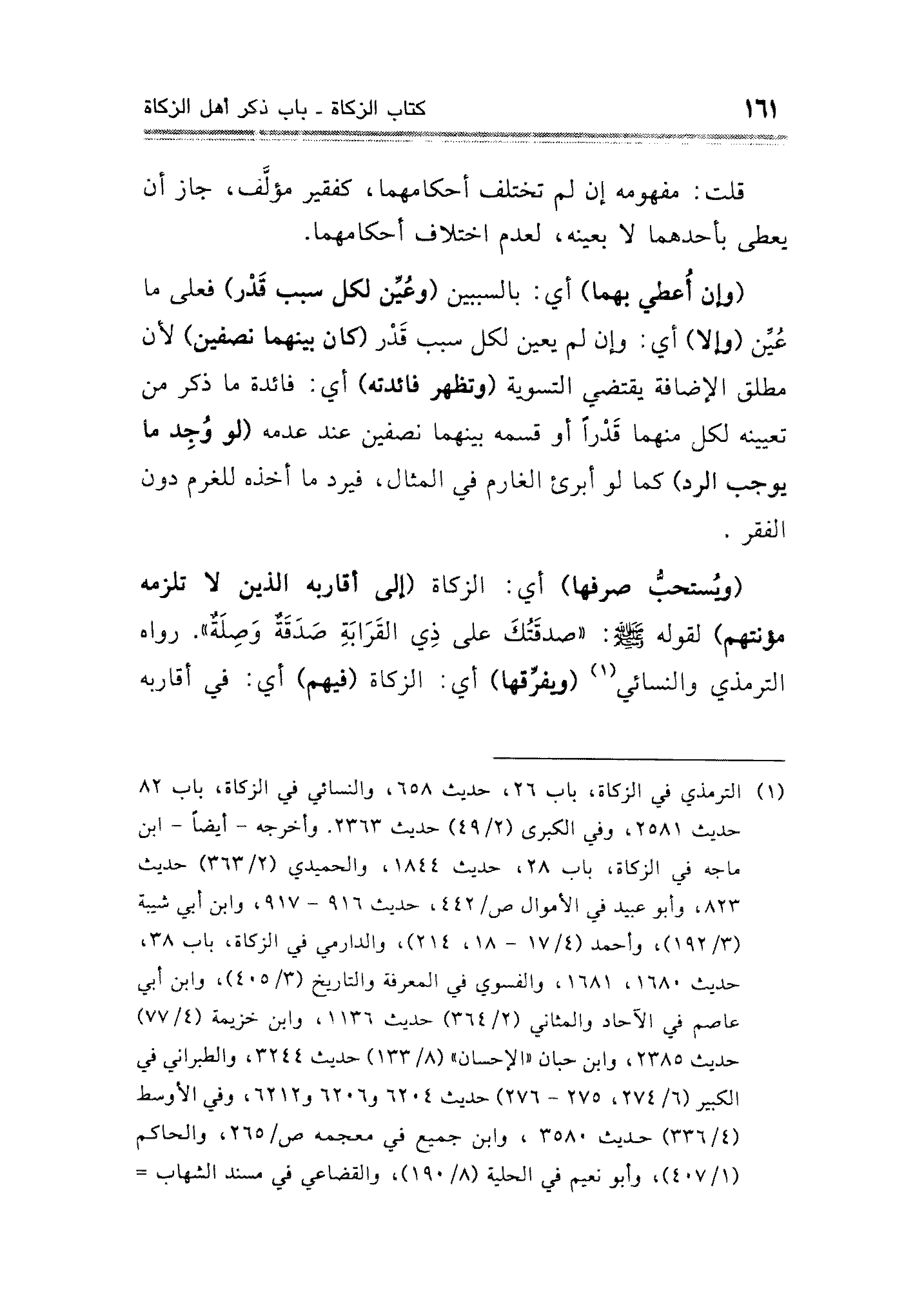 (ويُستحبُّ صرفها) أي: الزكاة (إلى أقاربه الذين لا تلزمه مؤنتهم) لقوله - صلى الله عليه وسلم -: "صدقَتُكَ على ذِي القَرَابَةِ صَدَقةٌ وَصِلَةٌ". رواه الترمذي والنسائي (¬١) (ويفرِّقها) أي: الزكاة (فيهم) أي: في أقاربه