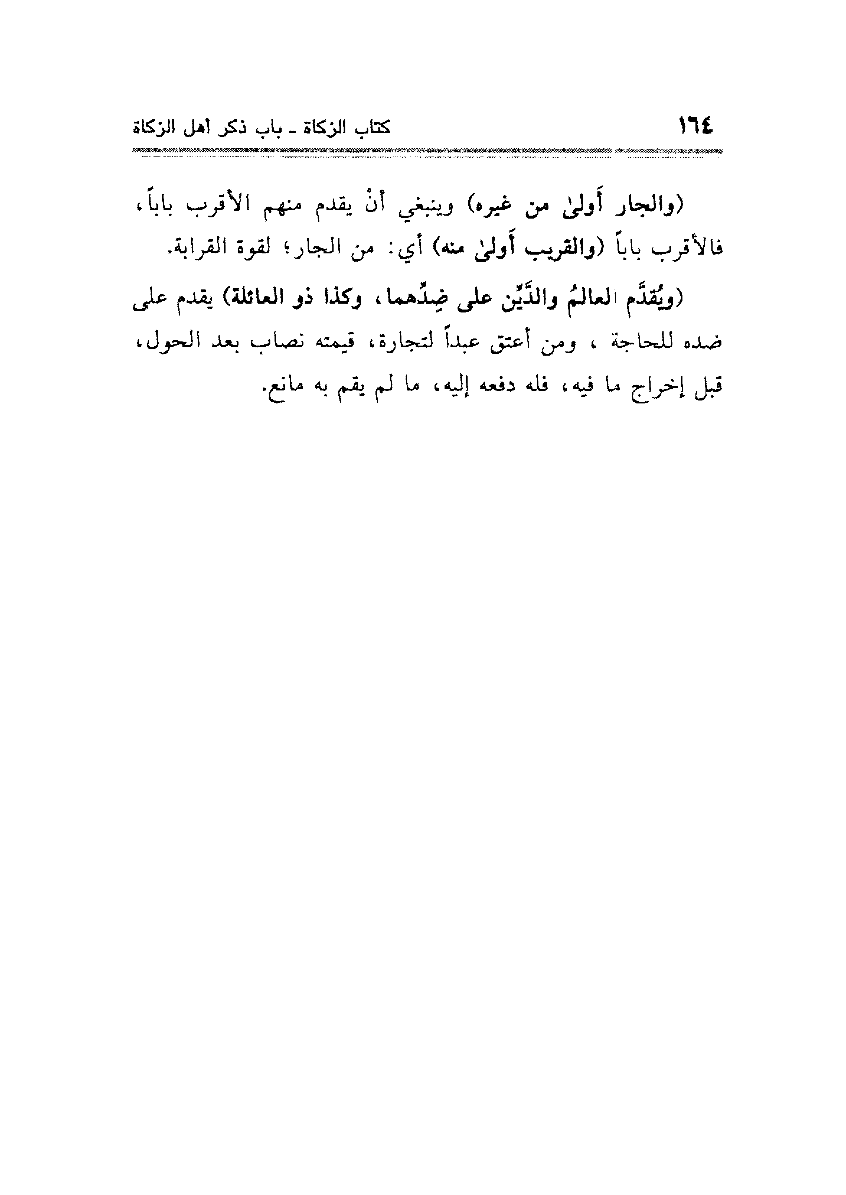 (ويقدَّم العالمُ والدَّيِّن على ضِدِّهما، وكذا ذو العائلة) يقدم على ضده للحاجة، ومن أعتق عبدًا لتجارة، قيمته نصاب بعد الحول، قبل إخراج ما فيه، فله دفعه إليه، ما لم يقم به مانع.