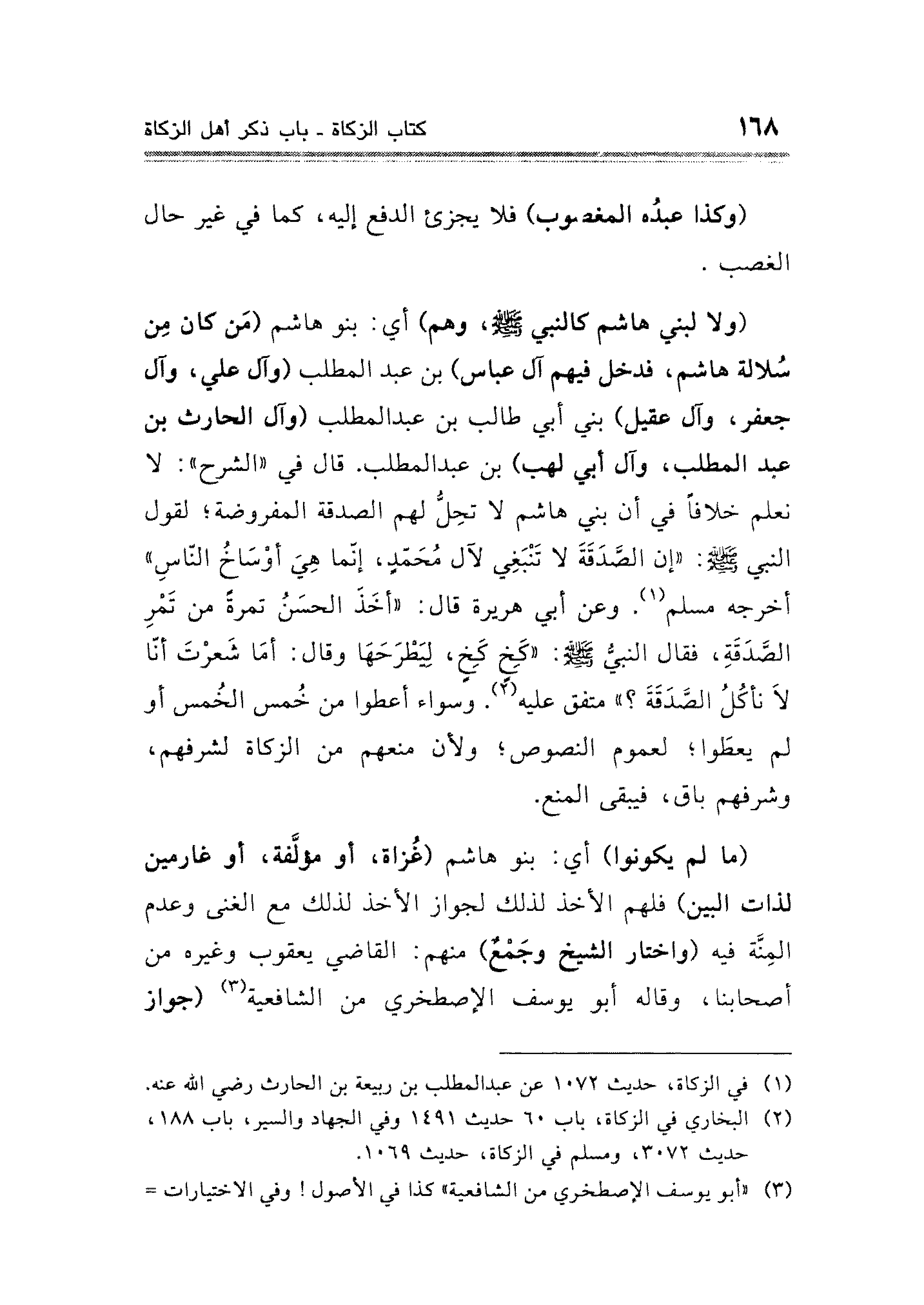 (ما لم يكونوا) أي: بنو هاشم (غُزاة، أو مؤلَّفة، أو غارمين لذات البين) فلهم الأخذ لذلك لجواز الأخذ لذلك مع الغنى وعدم المِنَّة فيه (واختار الشيخ وجمْعٌ) منهم: القاضي يعقوب وغيره من أصحابنا، وقاله أبو يوسف الإصطخري من الشافعية (¬٣) (جواز