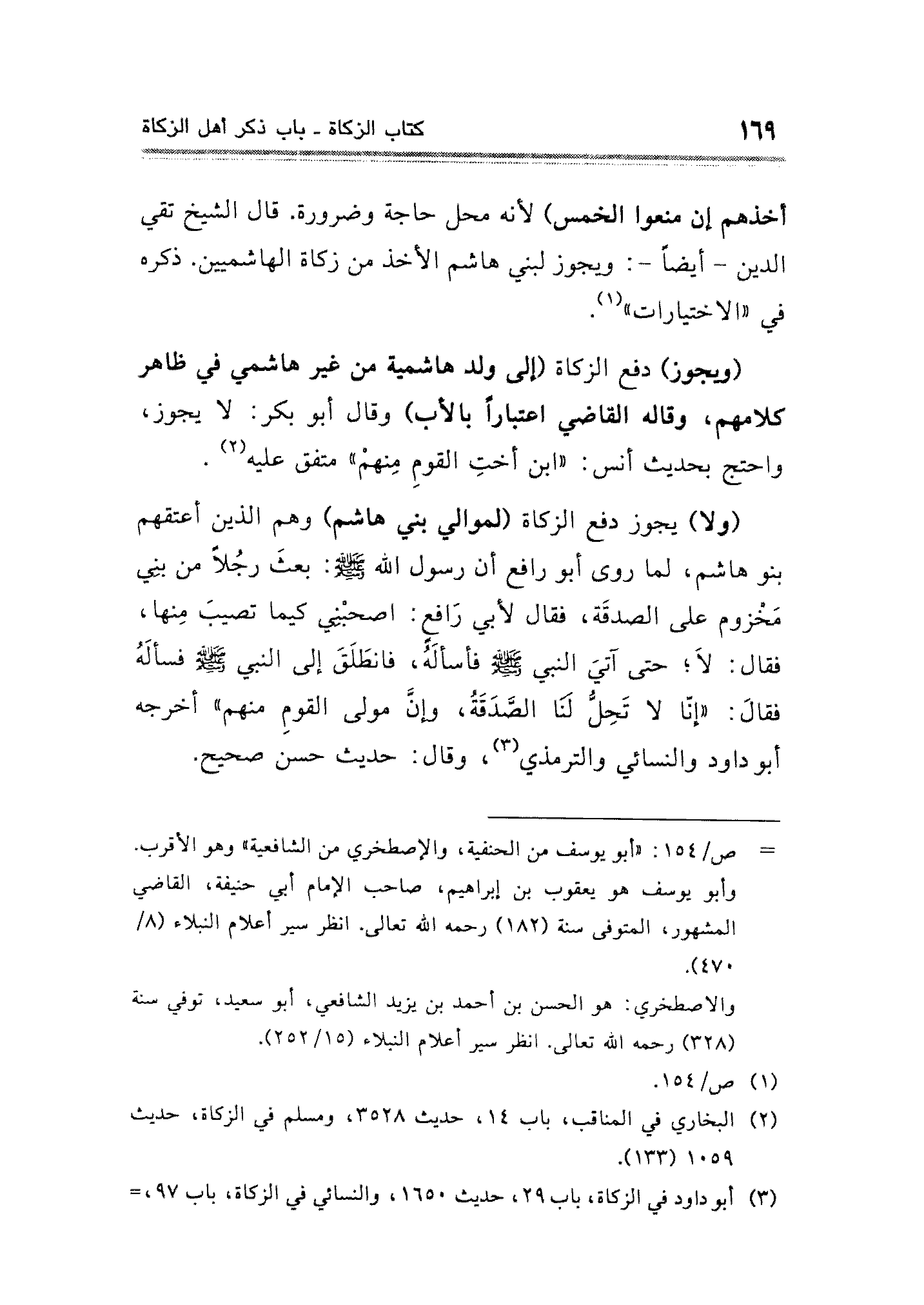 (ولا) يجوز دفع الزكاة (لموالي بني هاشم) وهم الذين أعتقهم بنو هاشم، لما روى أبو رافع أن رسول الله - صلى الله عليه وسلم -: بعثَ رجُلًا من بني مَخْزوم على الصدقَة، فقال لأبي رَافع: اصحبْني كيما تصيبَ مِنها، فقال: لَا؛ حتى آتيَ النبي - صلى الله عليه وسلم - فأسألهُ، فانطلَق إلى النبي - صلى الله عليه وسلم - فسألَهُ فقال: "إنّا لا تَحِلُّ لنَا الصَّدَقَةُ، وإنَّ مولى القومِ منهم" أخرجه أبو داود والنسائي والترمذي (¬٣)، وقال: حديث حسن صحيح.