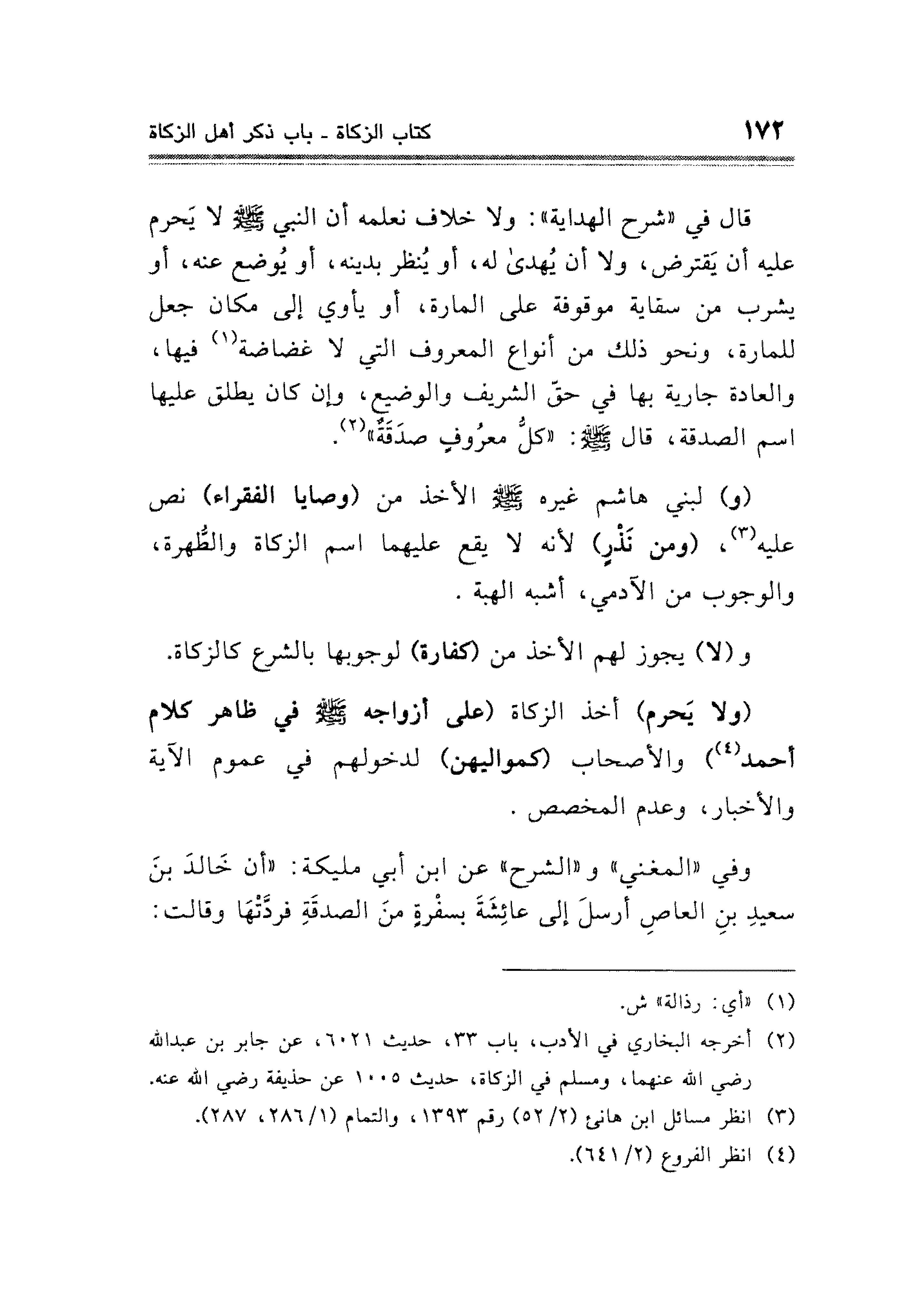 (ولا يَحرم) أخذ الزكاة (على أزواجه - صلى الله عليه وسلم - في ظاهر كلام أحمد (¬٤)) والأصحاب (كمواليهن) لدخولهم في عموم الآية والأخبار، وعدم المخصص.