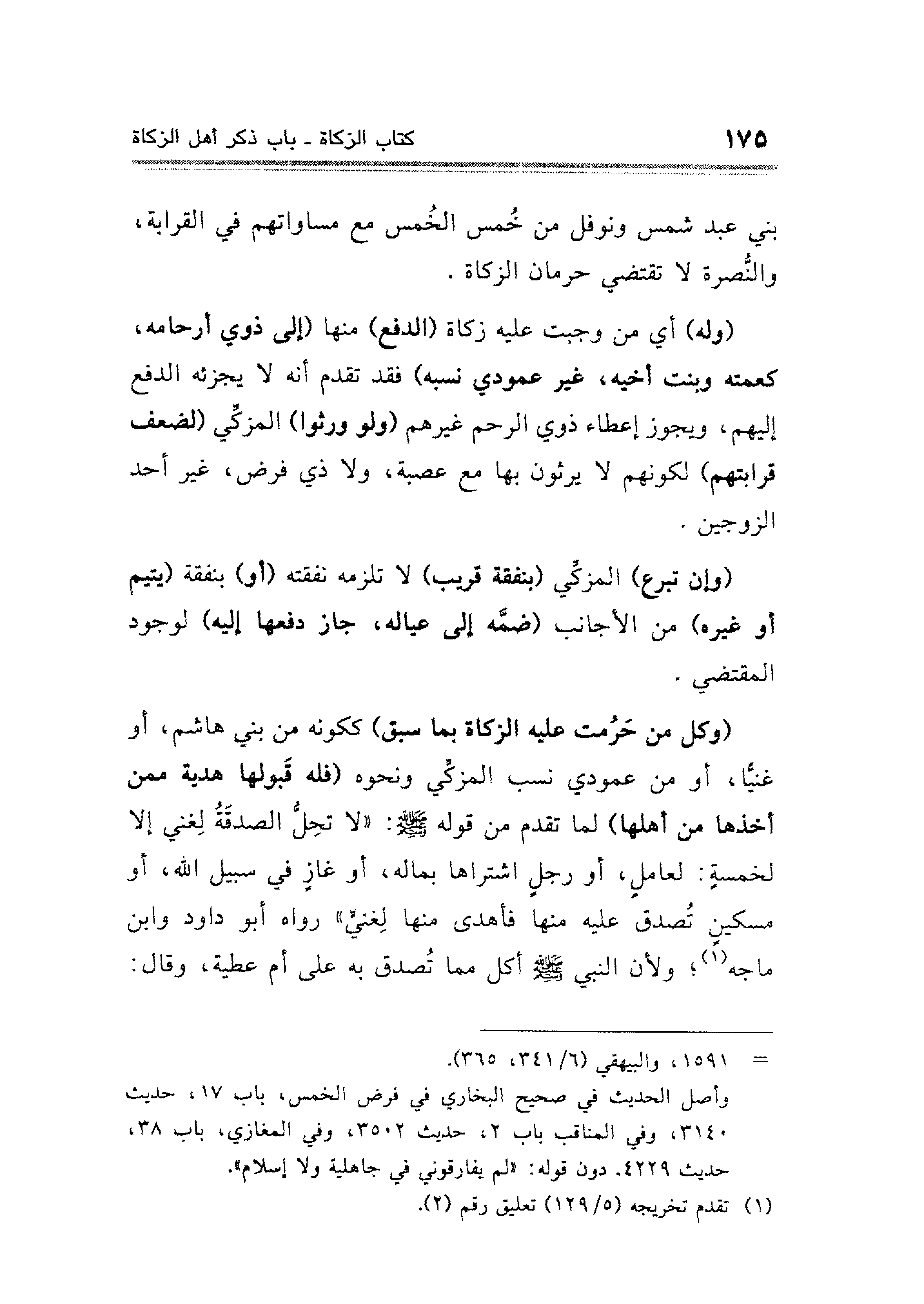بني عبد شمس ونوفل من خُمس الخُمس مع مساواتهم في القرابة، والنُّصرة لا تقتضي حرمان الزكاة.