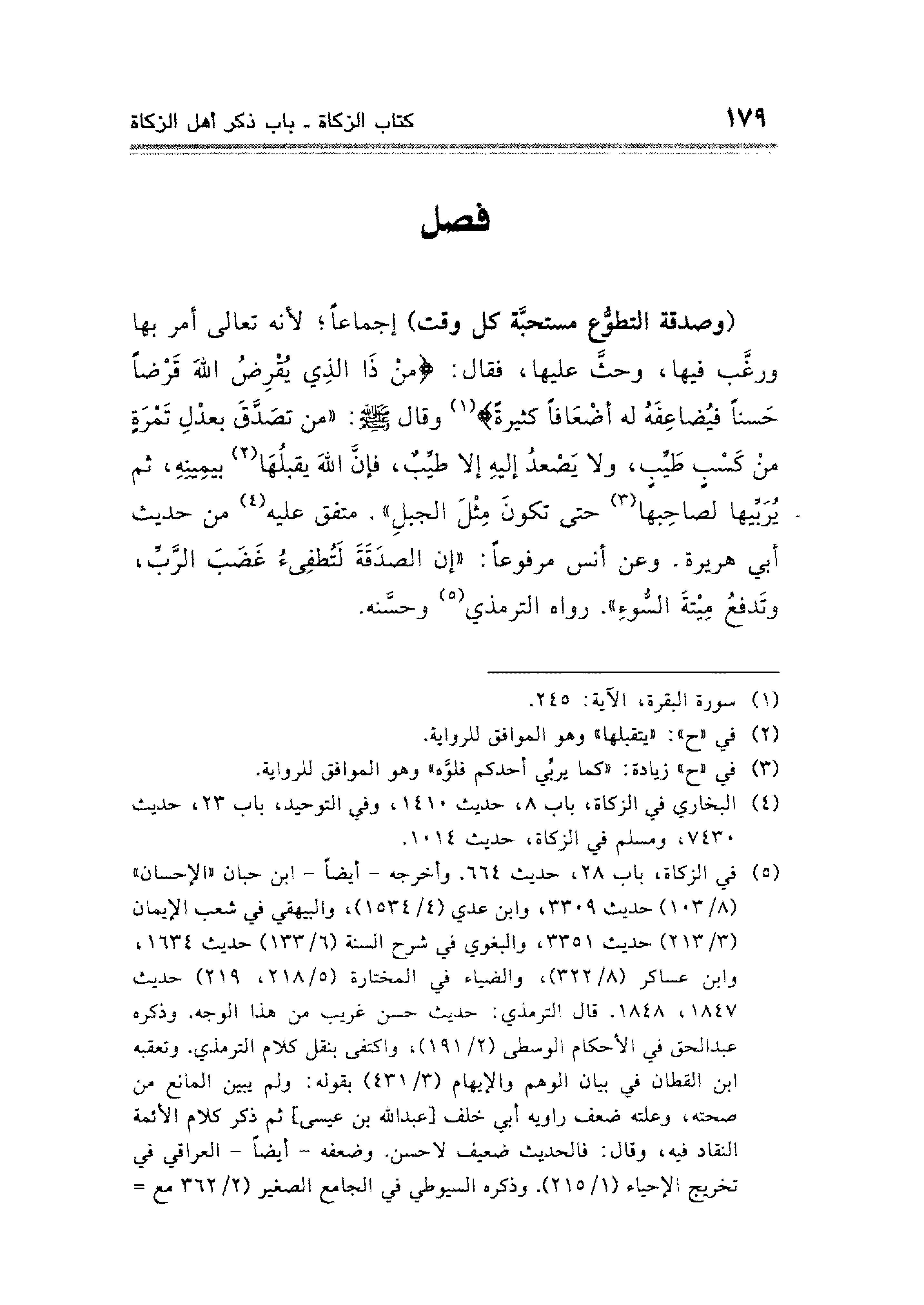 (وصدقة التطوُّع مستحبَّة كل وقت) إجماعًا؛ لأنه تعالى أمر بها ورغَّب فيها، وحثَّ عليها، فقال: {مَنْ ذَا الَّذِي يُقْرِضُ اللَّهَ قَرْضًا حَسَنًا فَيُضَاعِفَهُ لَهُ أَضْعَافًا كَثِيرَةً} (¬١) وقال: - صلى الله عليه وسلم - "من تصَدقَ بعدلِ تَمرَةٍ من كَسبٍ طيِّبٍ، ولا يَصعد إليهِ إلا طيِّبٌ، فإن الله يقبلها (¬٢) بيمِينهِ، ثم يُرَبِّيها لصاحِبها (¬٣) حتى تكونَ مِثْلَ الجبلِ". متفق عليه (¬٤) من حديث أبي هريرة. وعن أنس مرفوعًا: "إن الصدَقَةَ لتطفئُ غضَبَ الرب، وتَدفعُ مِيتةَ السوء". رواه الترمذي (¬٥) وحسنه.