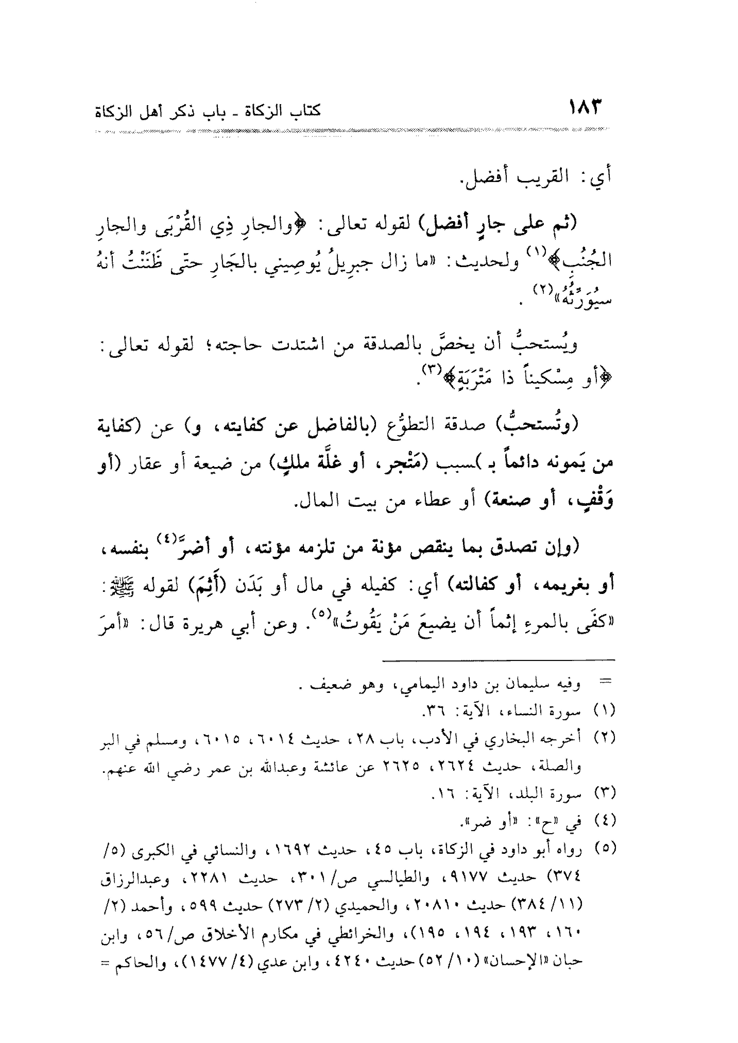 (ثم على جارٍ أفضل) لقوله تعالى: {وَالْجَارِ ذِي الْقُرْبَى وَالْجَارِ الْجُنُبِ} (¬١) ولحديث: "ما زال جبرِيلُ يُوصِيني بالجَارِ حتْى ظَنَنْتُ أنهُ سيُوَرِّثُهُ" (¬٢).