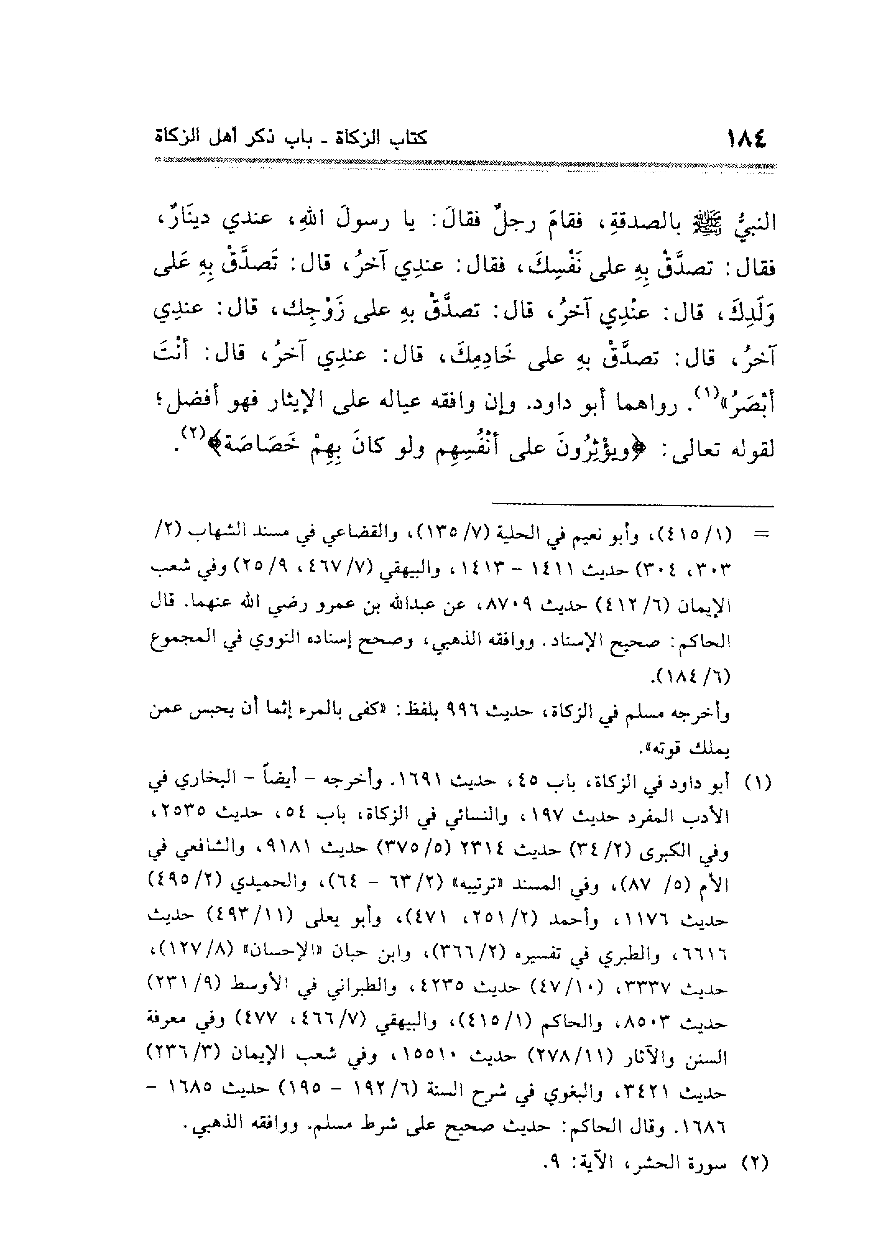النبيُّ - صلى الله عليه وسلم - بالصدقةِ، فقامَ رجلٌ فقال: يا رسولَ اللهِ، عندي دينَارٌ، فقال: تصدَّق بِهِ على نَفْسِكَ، فقال: عندِي آخرُ، قال: تَصدَّق بِهِ عَلى وَلَدِكَ، قال: عنْدِي آخرُ، قال: تصدَّقْ بهِ على زَوْجِك، قال: عندِي آخرُ، قال: تصدَّقْ بهِ على خَادِمِكَ، قال: عندِي آخرُ، قال: أنْتَ أبْصَرُ" (¬١). رواهما أبو داود. وإن وافقه عياله على الإيثار فهو أفضل؛ لقوله تعالى: {وَيُؤْثِرُونَ عَلَى أَنْفُسِهِمْ وَلَوْ كَانَ بِهِمْ خَصَاصَةٌ} (¬٢).