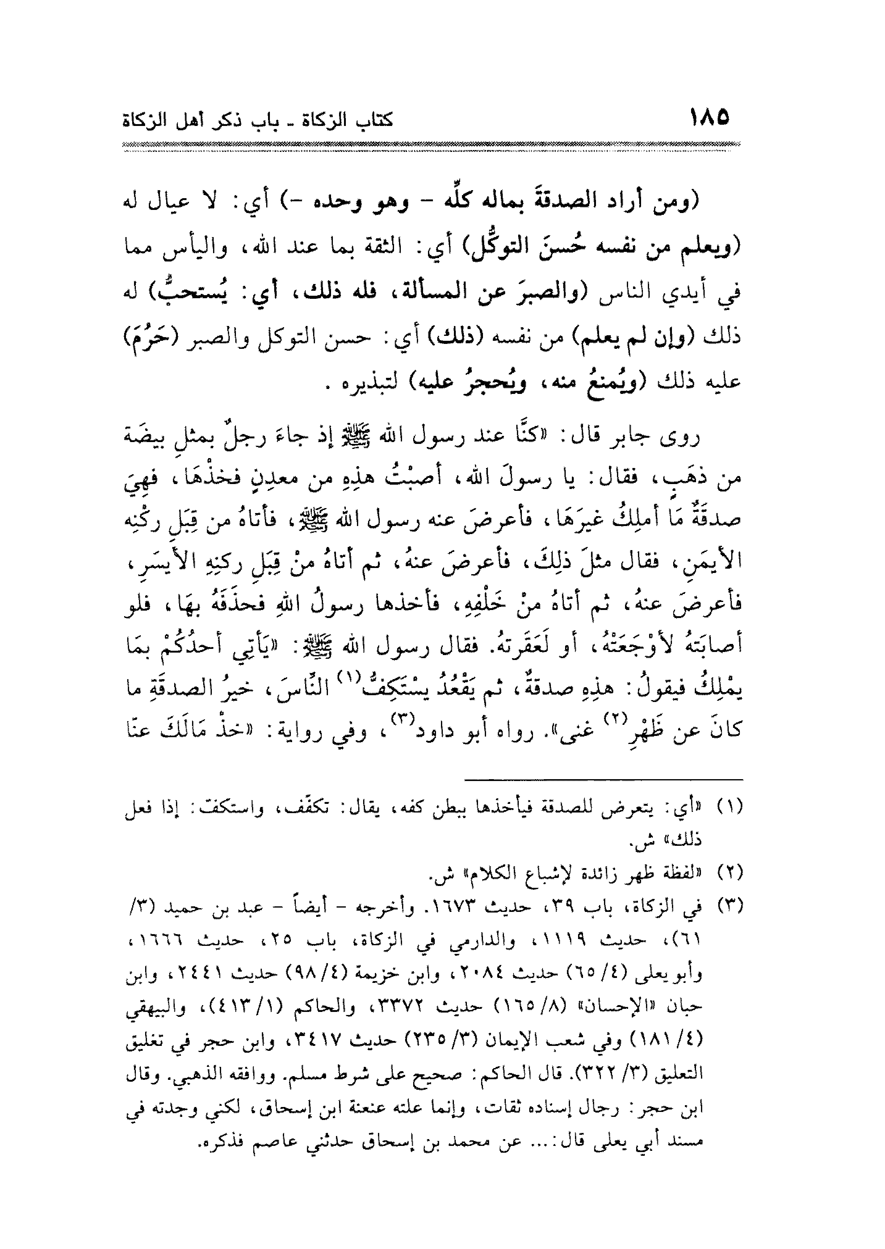 روى جابر قال: "كنَّا عند رسول الله - صلى الله عليه وسلم - إذ جاءَ رجلٌ بمثلِ بيضَةَ من ذهَب، فقال: يا رسولَ الله، أصبْتُ هذِهِ من معدِنٍ فخذْهَا، فهِيَ صدقَةٌ مَا أملِكُ غيرَهَا، فأعرضَ عنه رسول الله - صلى الله عليه وسلم -، فأتاهُ من قِبَلِ ركْنِه الأيمَنِ، فقال مثلَ ذلِكَ، فأعرضَ عنهُ، ثم أتاهُ من قِبَلِ ركنِهِ الأيسَرِ، فأعرضَ عنهُ، ثم أتاهُ من خَلْفِهِ، فأخذها رسولُ اللهِ فحذَفَهُ بهَا، فلو أصابَتهُ لأوْجَعَتْهُ، أو لَعَقرتهُ. فقال رسول الله - صلى الله عليه وسلم -: "يَأتِي أحدُكُمْ بمَا يمْلِكُ فيقولُ: هذِهِ صدقةٌ، ثم يَقْعُدُ يسْتَكِفُّ (¬١) النِّاسَ، خيرُ الصدقَةِ ما كانَ عن ظَهْرِ (¬٢) غنى". رواه أبو داود (¬٣)، وفي رواية: "خذْ مَالكَ عنّا