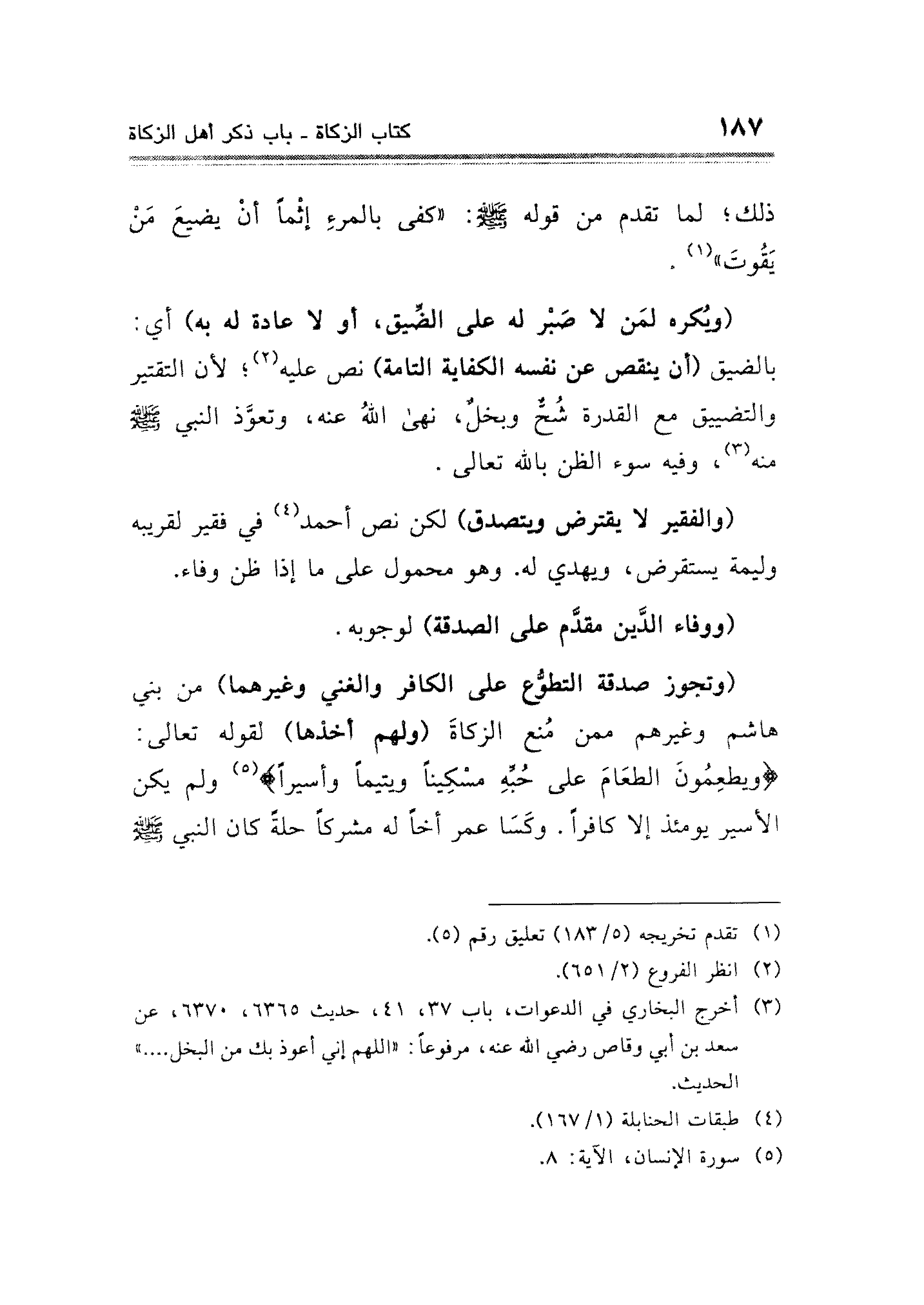 (وتجوز صدقة التطوُّع على الكافر والغني وغيرهما) من بني هاشم وغيرهم ممن مُنع الزكاةَ (ولهم أخذها) لقوله تعالى: {وَيُطْعِمُونَ الطَّعَامَ عَلَى حُبِّهِ مِسْكِينًا وَيَتِيمًا وَأَسِيرًا} (¬٥) ولم يكن الأسير يومئذ إلا كافرًا. وكَسَا عمر أخًا له مشركًا حلةً كان النبي - صلى الله عليه وسلم -