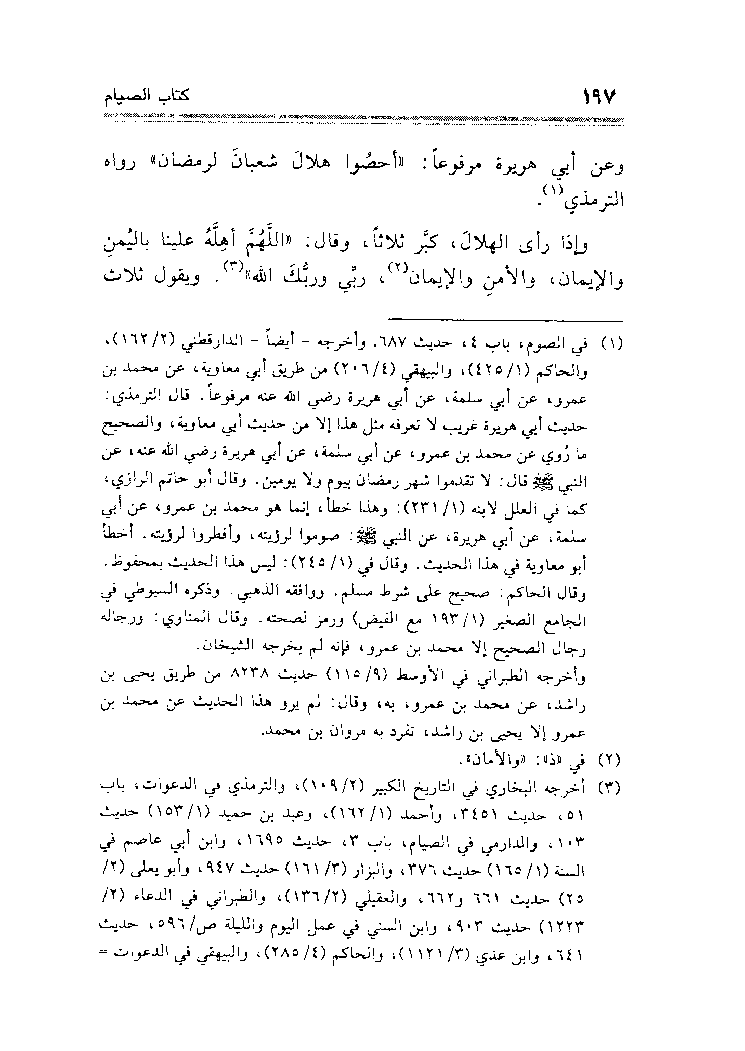 وإذا رأى الهلال، كبَّر ثلاثًا، وقال: "اللَّهُمَّ أهِلَّهُ علينا باليُمنِ والإيمان، والأمنِ والإيمان (¬٢)، ربِّي وربُّكَ الله" (¬٣). ويقول ثلاث