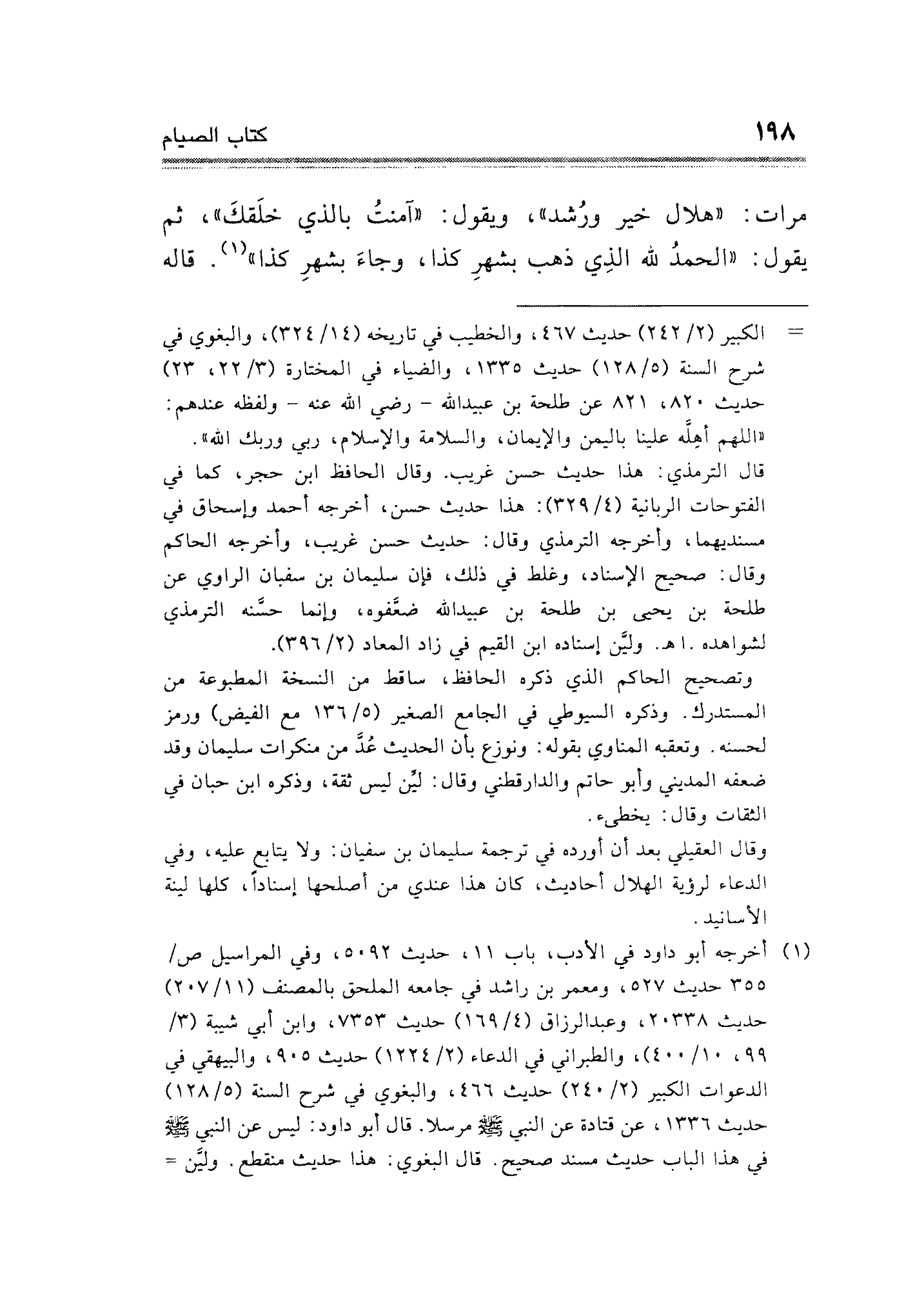 وقال العقيلي بعد أن أورده في ترجمة سليمان بن سفيان: ولا يتابع عليه وفي الدعاء لرؤية الهلال أحاديث، وإن هذا عندي من أصلحها إسنادًا، كلها لينة الأسانيد.