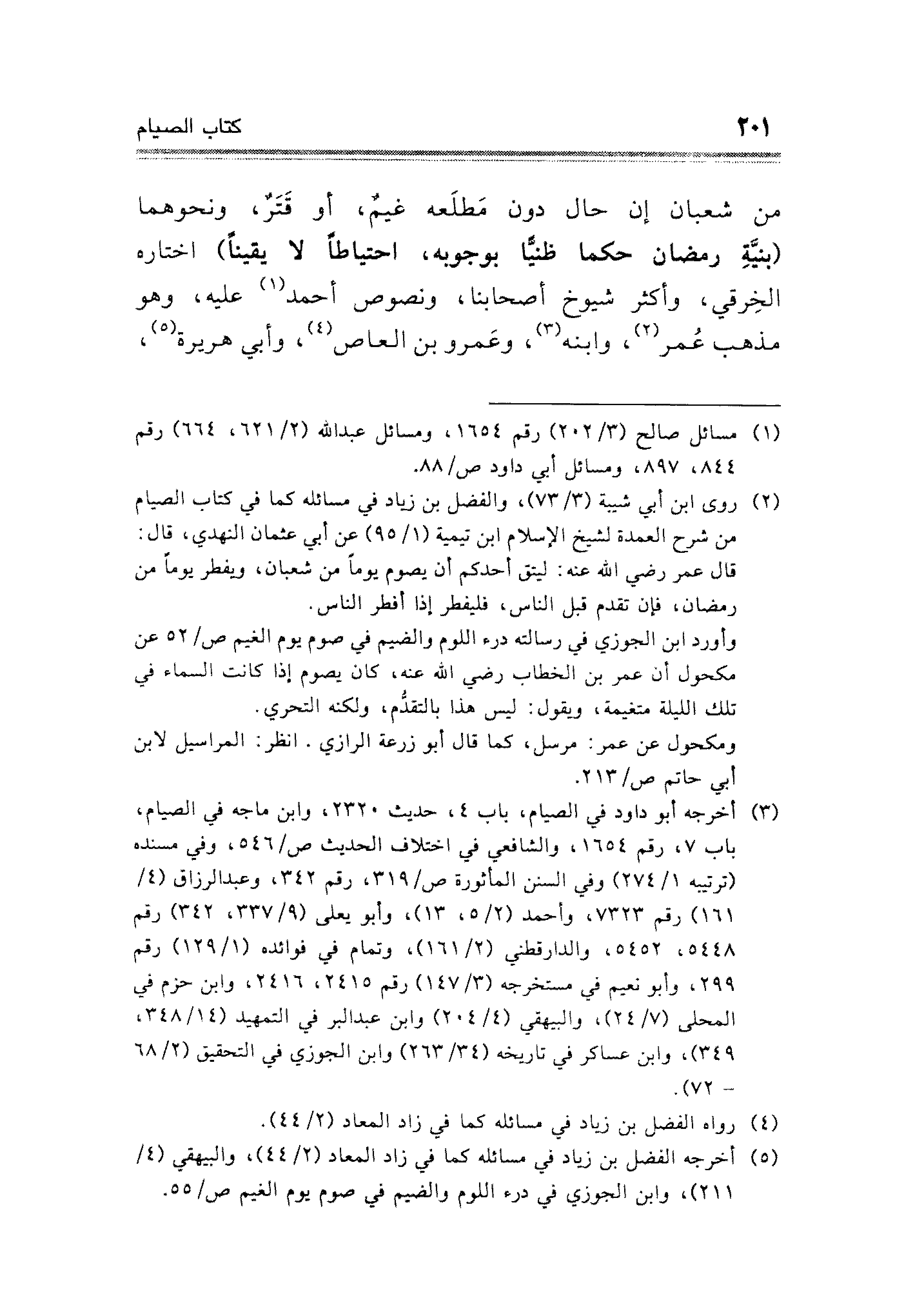 (¬٥) أخرجه الفضل بن زياد في مسائله كما في زاد المعاد (٢/ ٤٤)، والبيهقي (٤/ ٢١١)، وابن الجوزي في درء اللوم والضيم في صوم يوم الغيم ص / ٥٥.