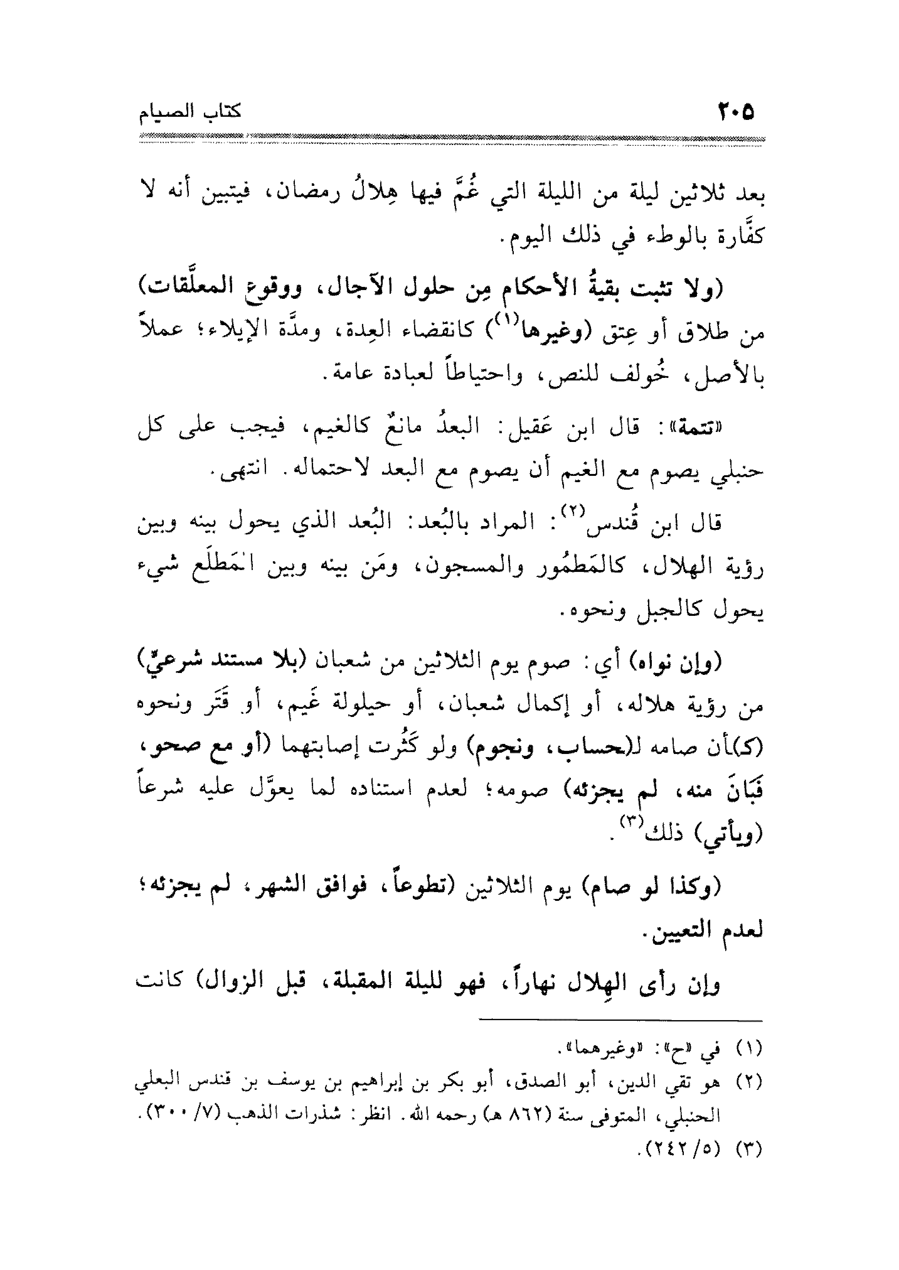 قال ابن قُندس (¬٢): المراد بالبُعد: البُعد الذي يحول بينه وبين رؤية الهلال، كالمَطمُور والمسجون، ومَن بينه وبين المَطلَع شيء يحول كالجبل ونحوه.